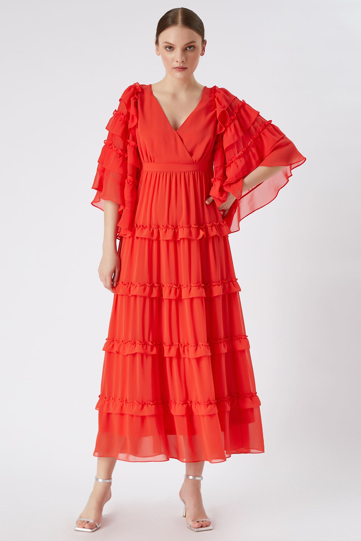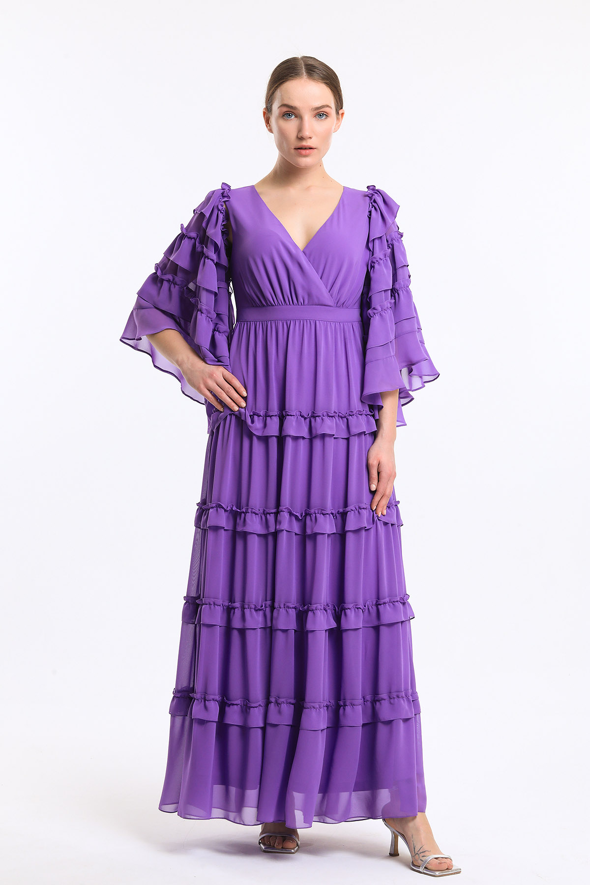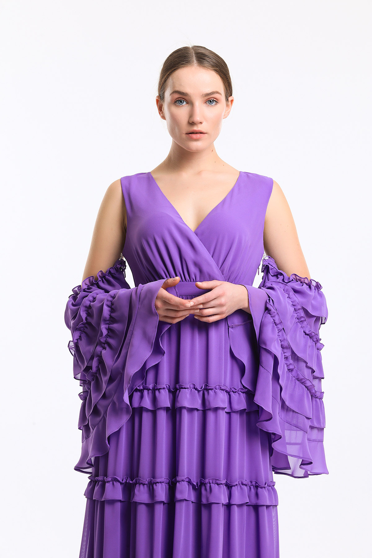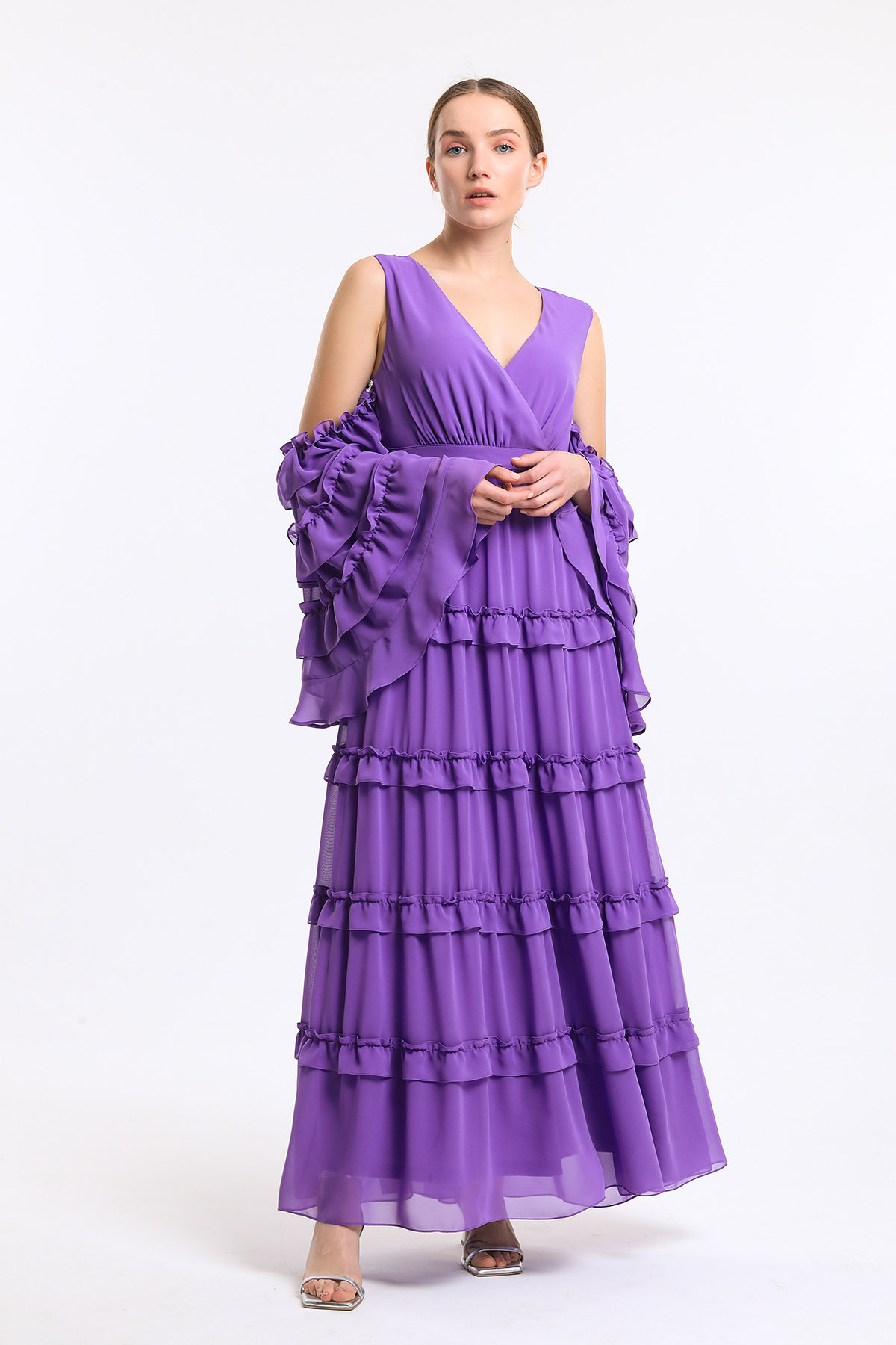 ÜRÜN BİLGİSİ:Anvelop yakalı,etek uçları fırfır ve katlı,çıkarılabilir kol detaylı,astarlı uzun elbise