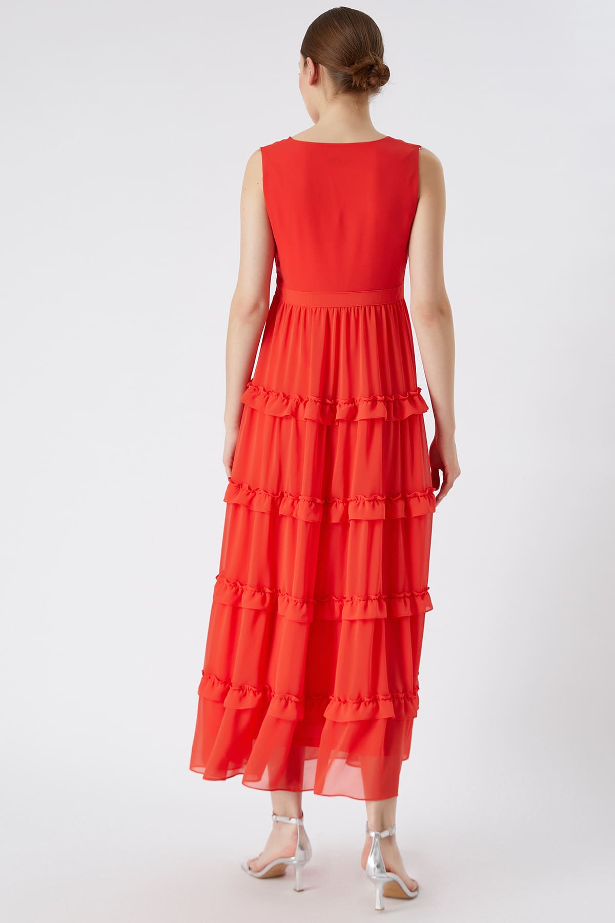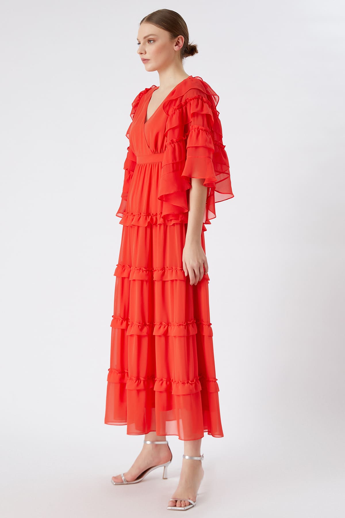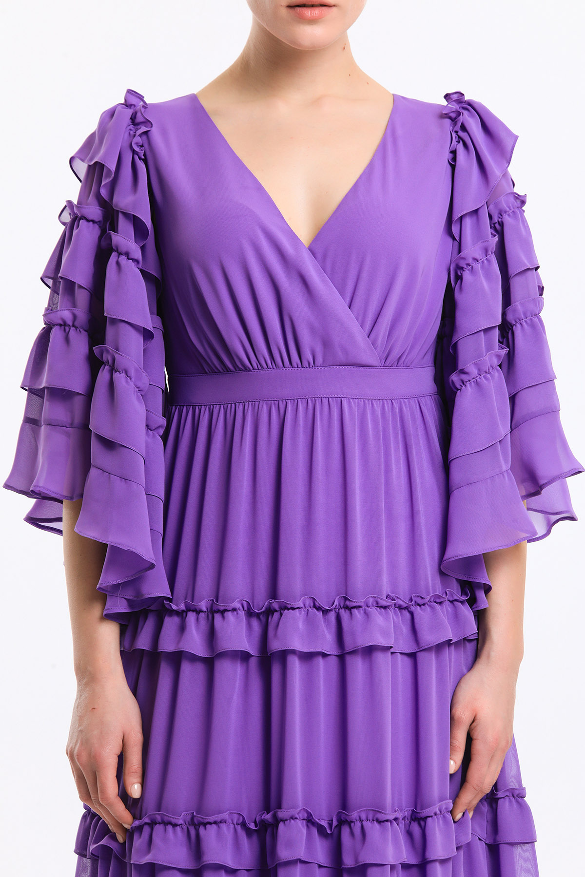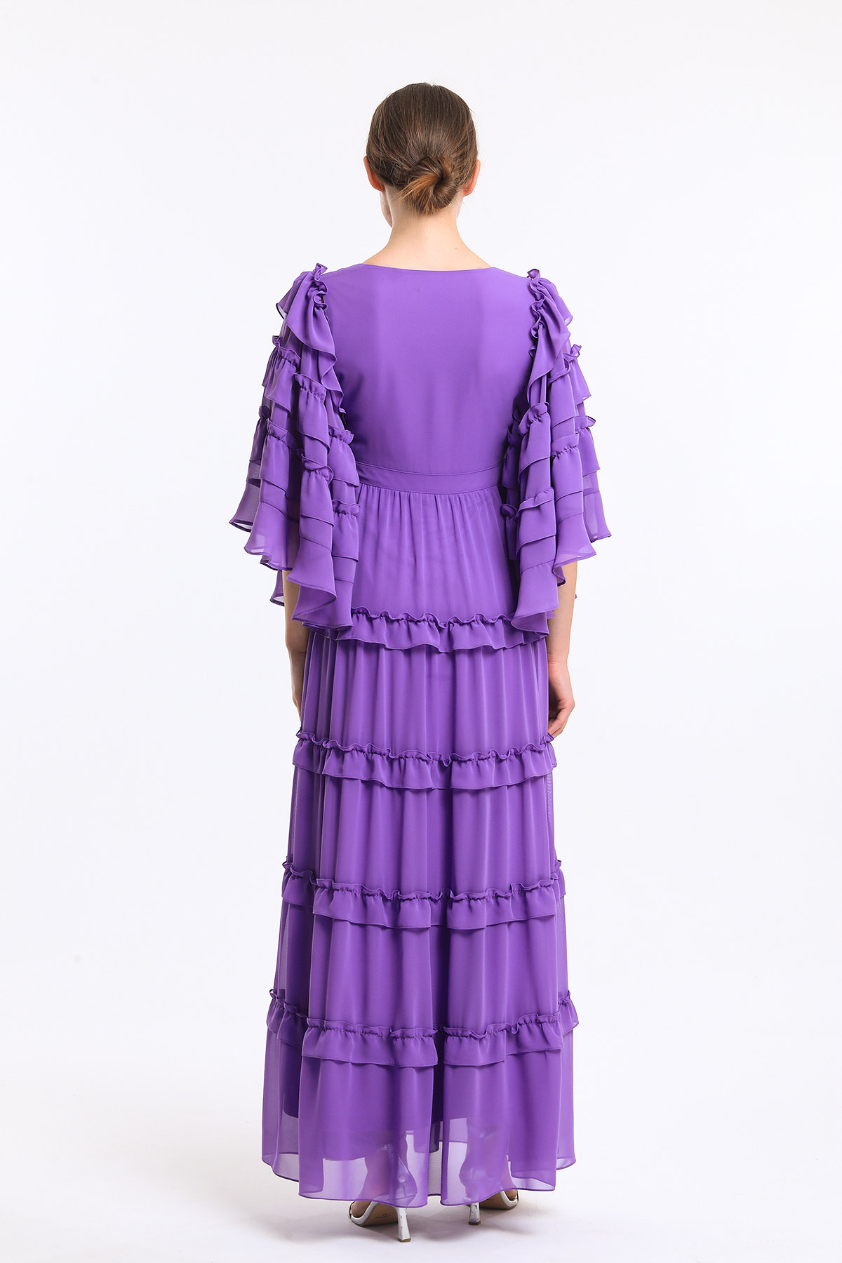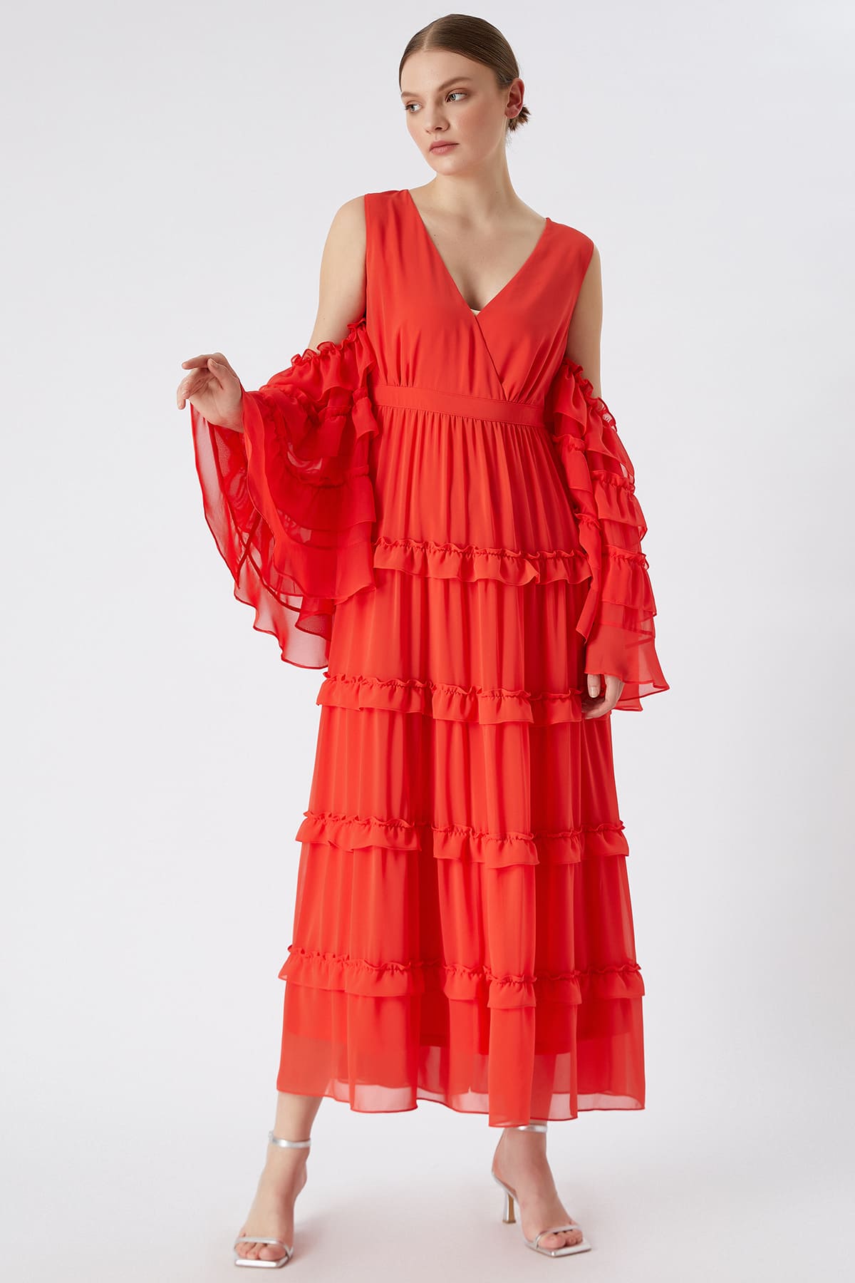 ÜRÜN BİLGİSİ:Anvelop yakalı,etek uçları fırfır ve katlı,çıkarılabilir kol detaylı,astarlı uzun elbise
