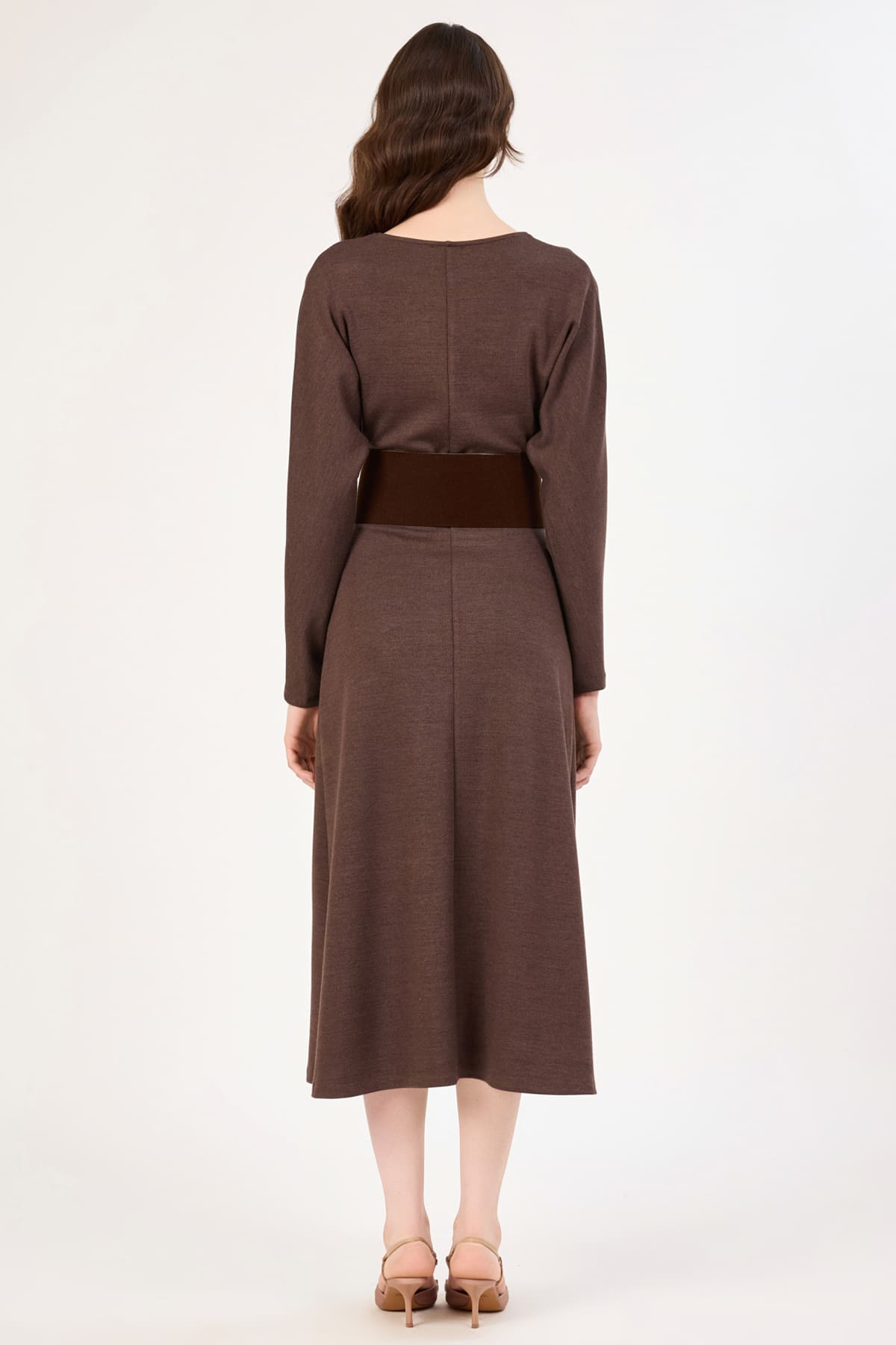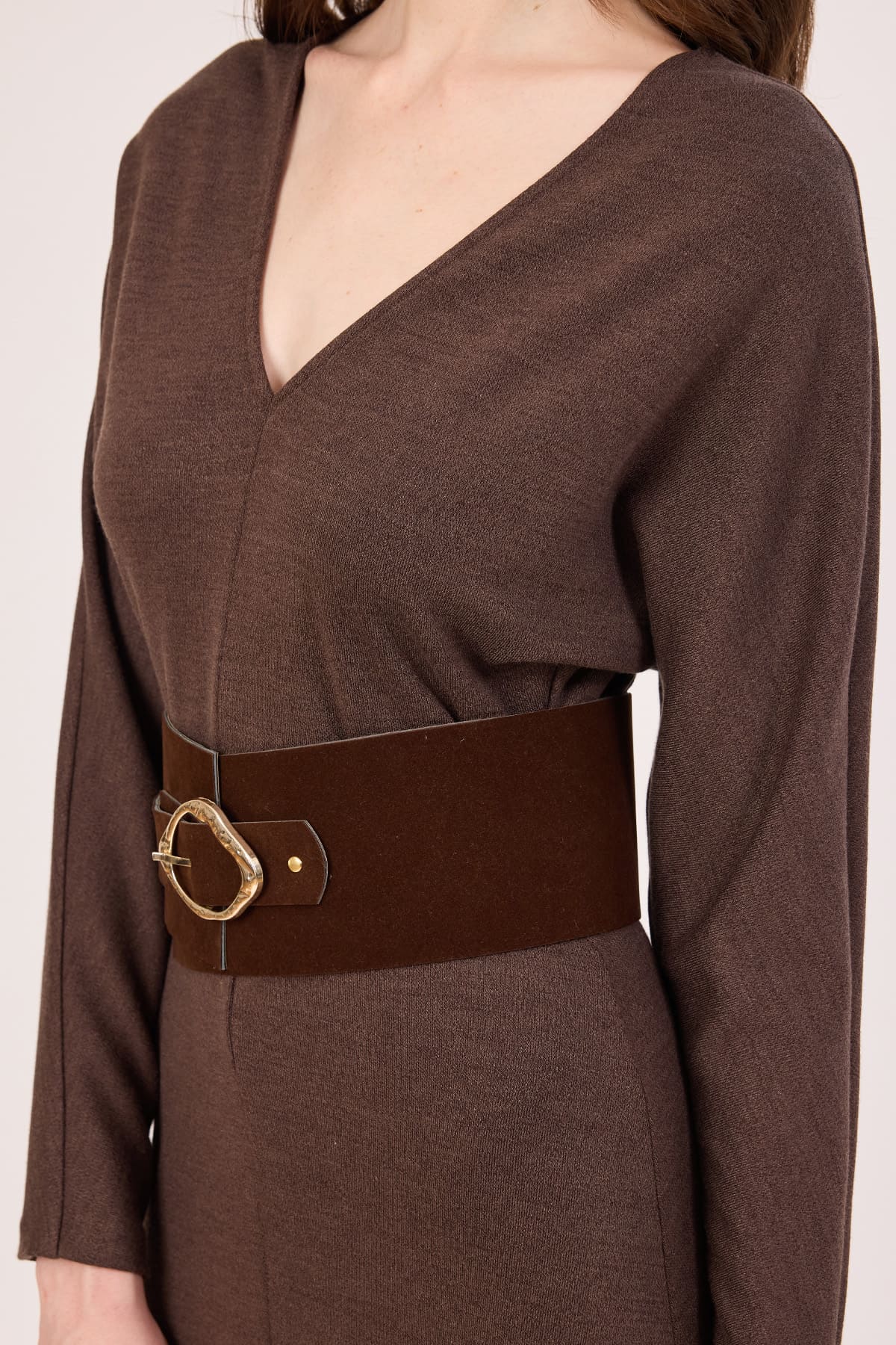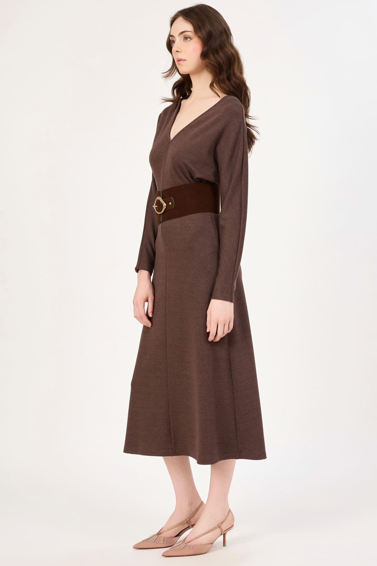 V yakalı süet kemerli midi elbise