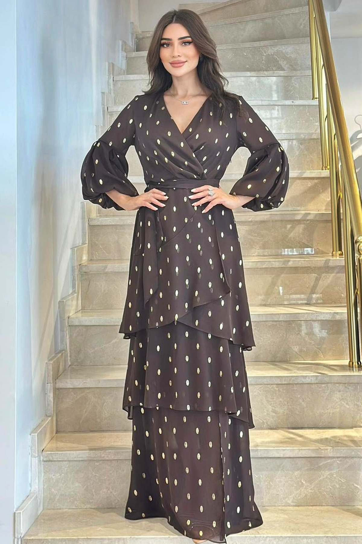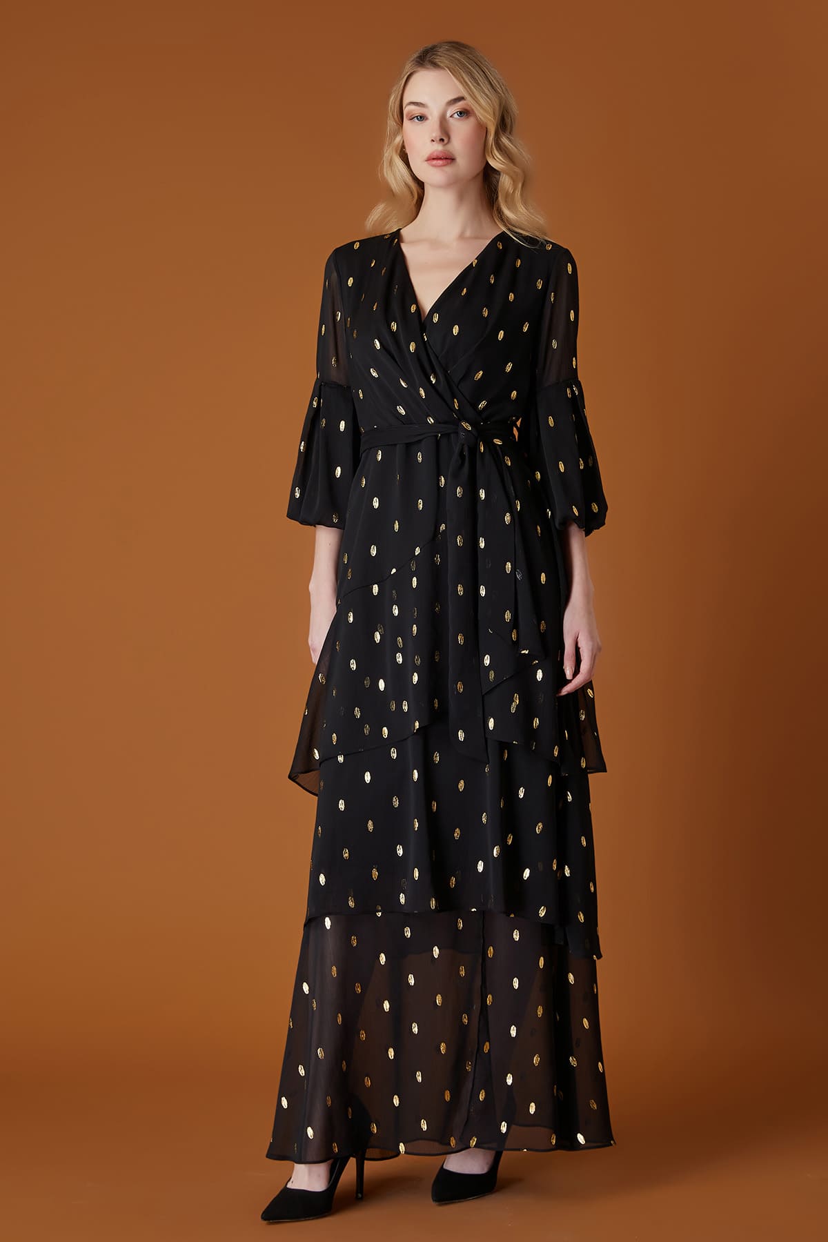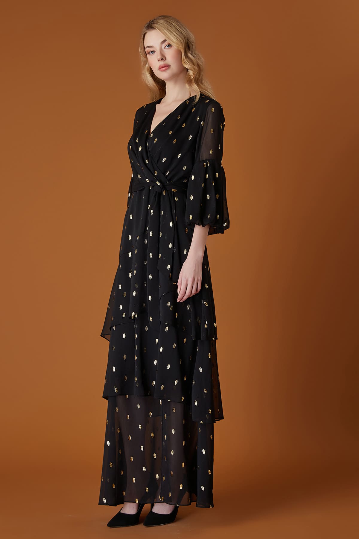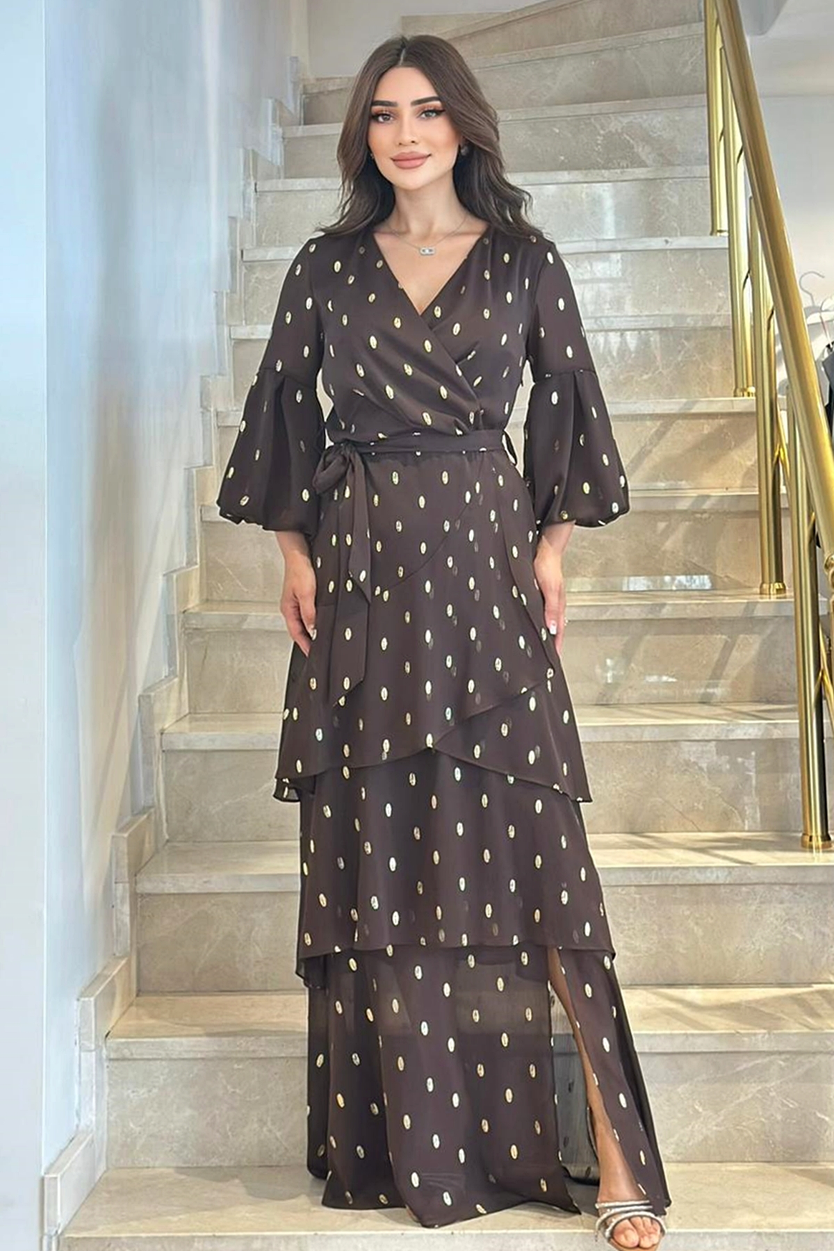 ÜRÜN BİLGİSİ:Krinkıl dokulu ,altın soyut puan varak baskılı,anvelop yakalı,etek parçası katmanlı,beli kumaş bağcıklı,astarlı maxi elbise