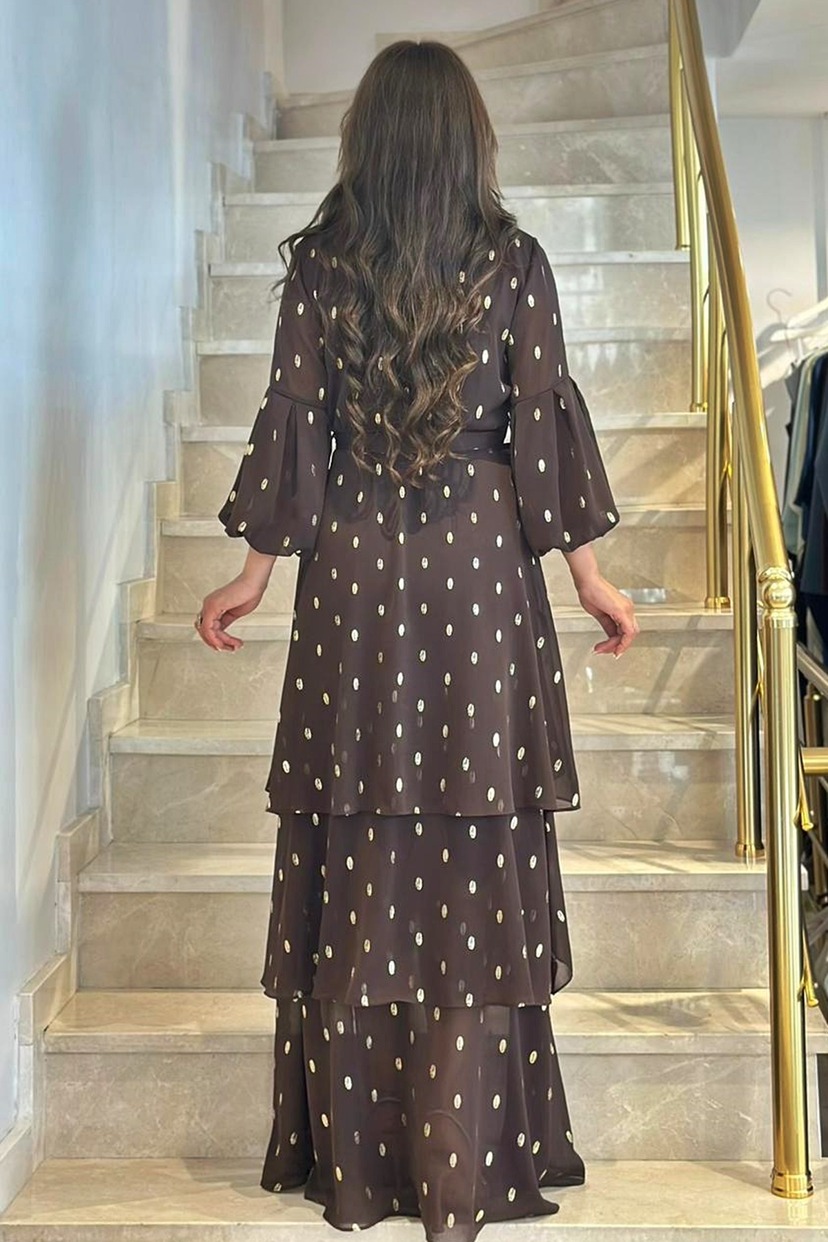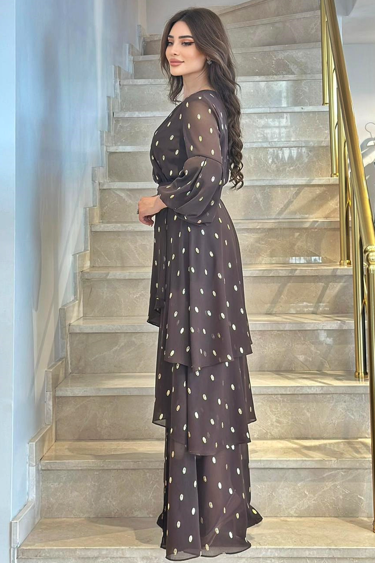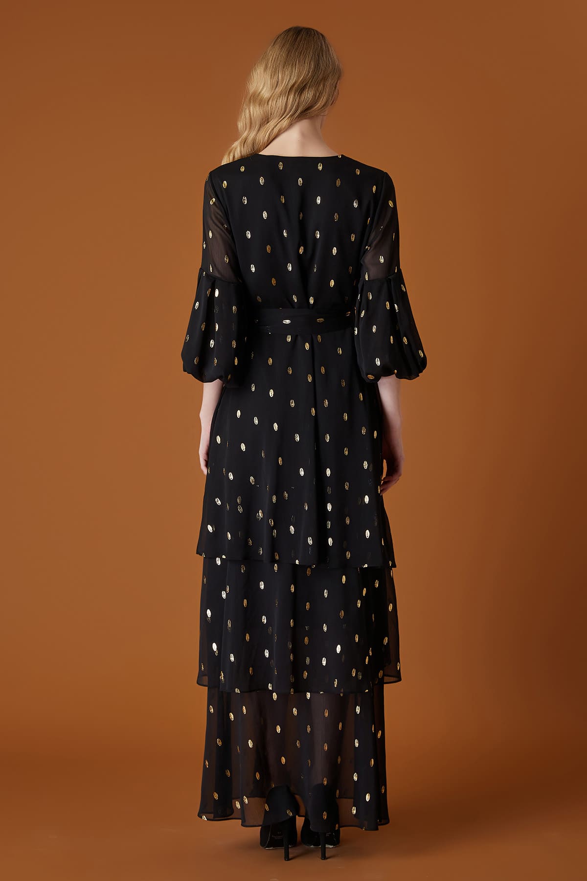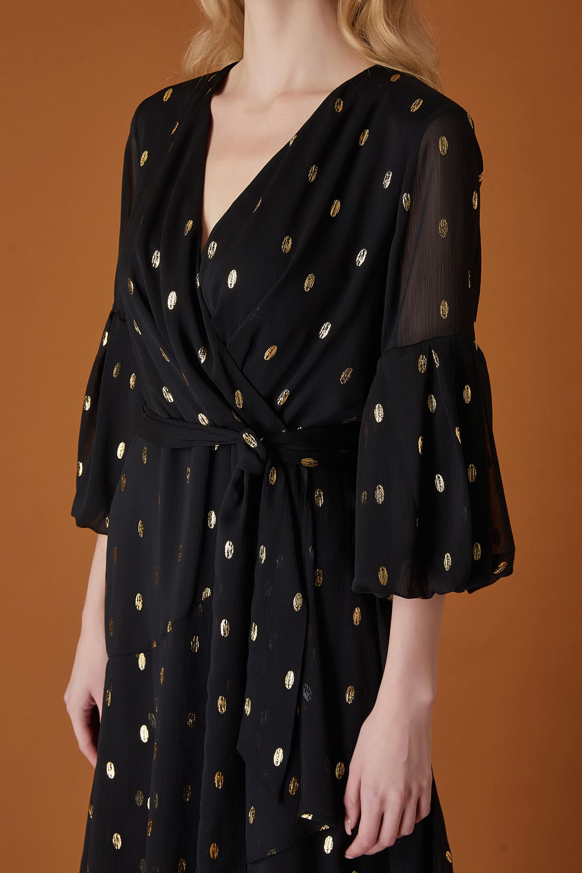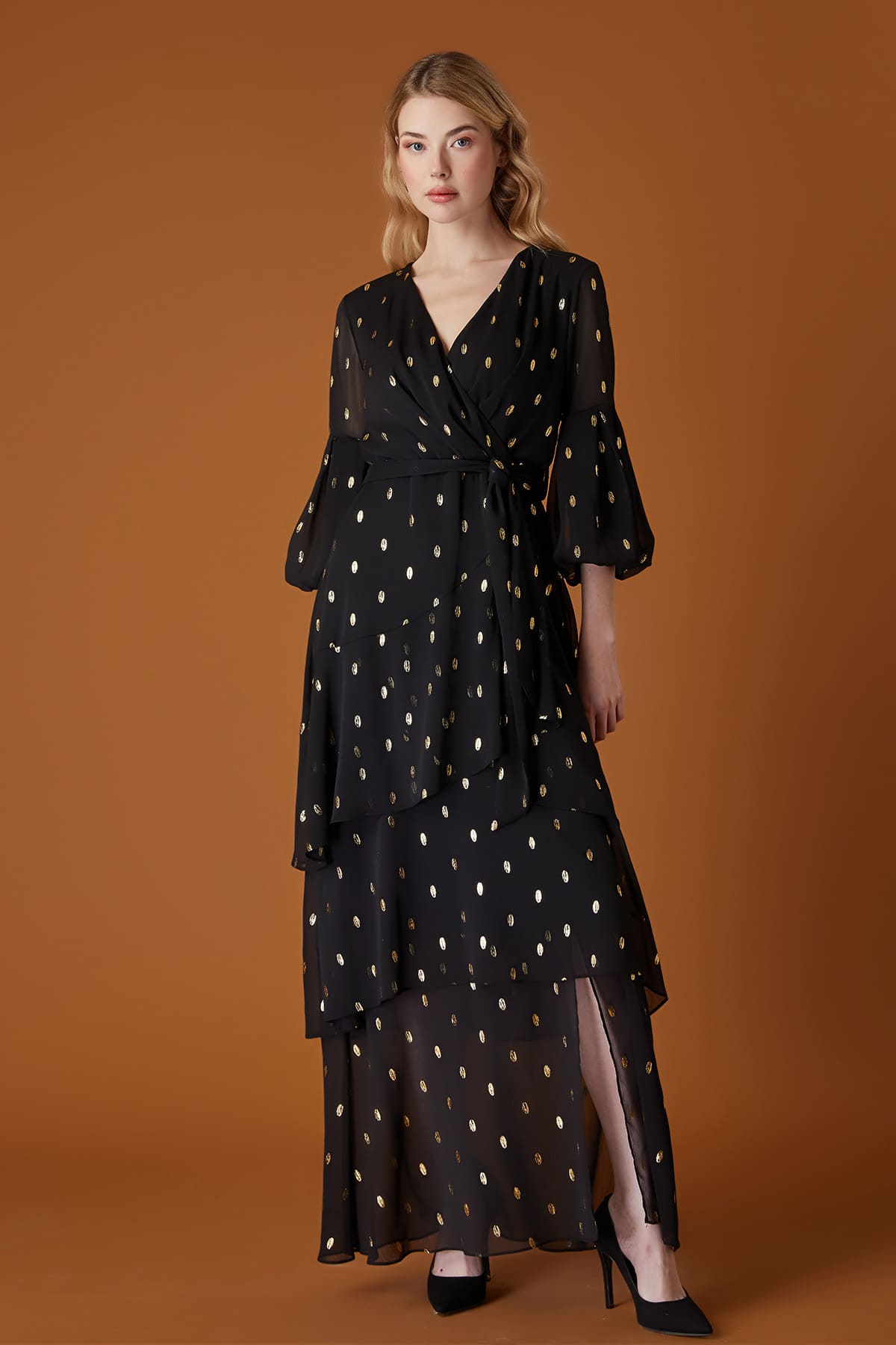 ÜRÜN BİLGİSİ:Krinkıl dokulu ,altın soyut puan varak baskılı,anvelop yakalı,etek parçası katmanlı,beli kumaş bağcıklı,astarlı maxi elbise