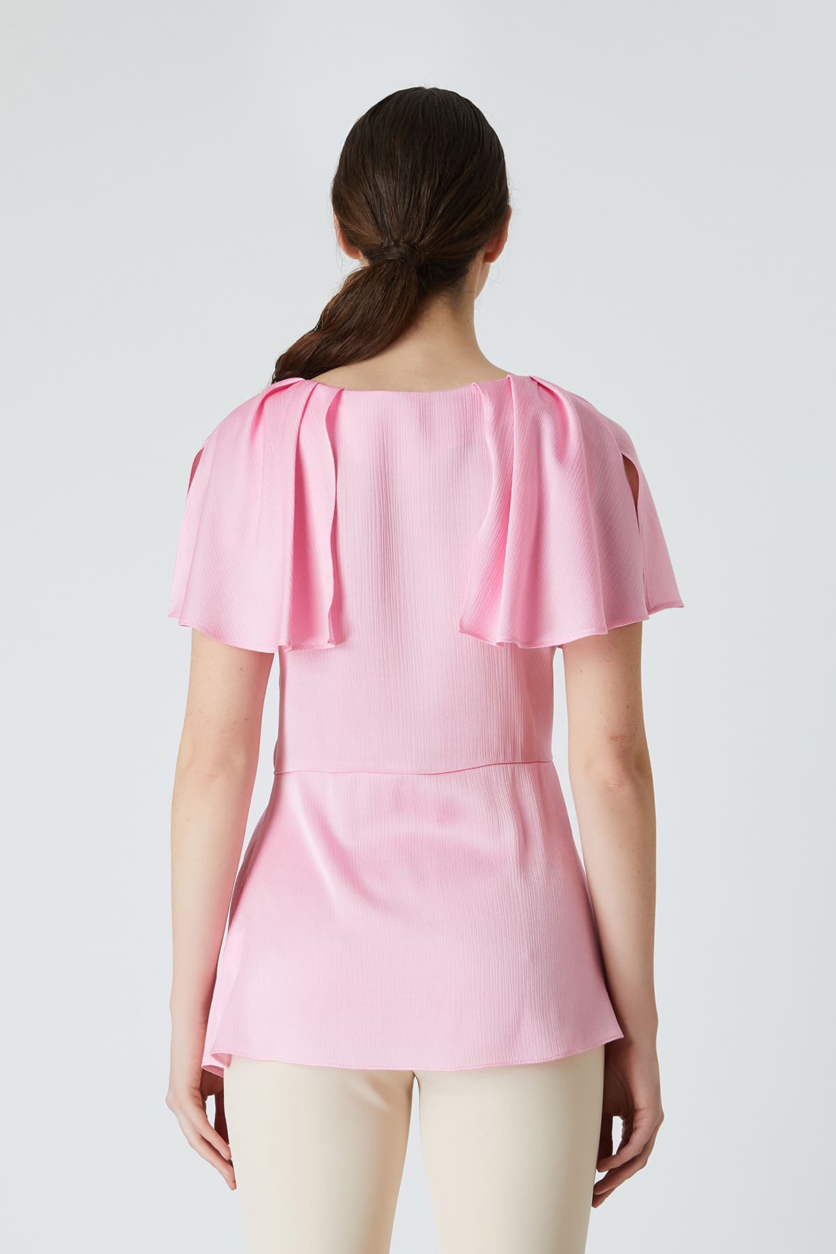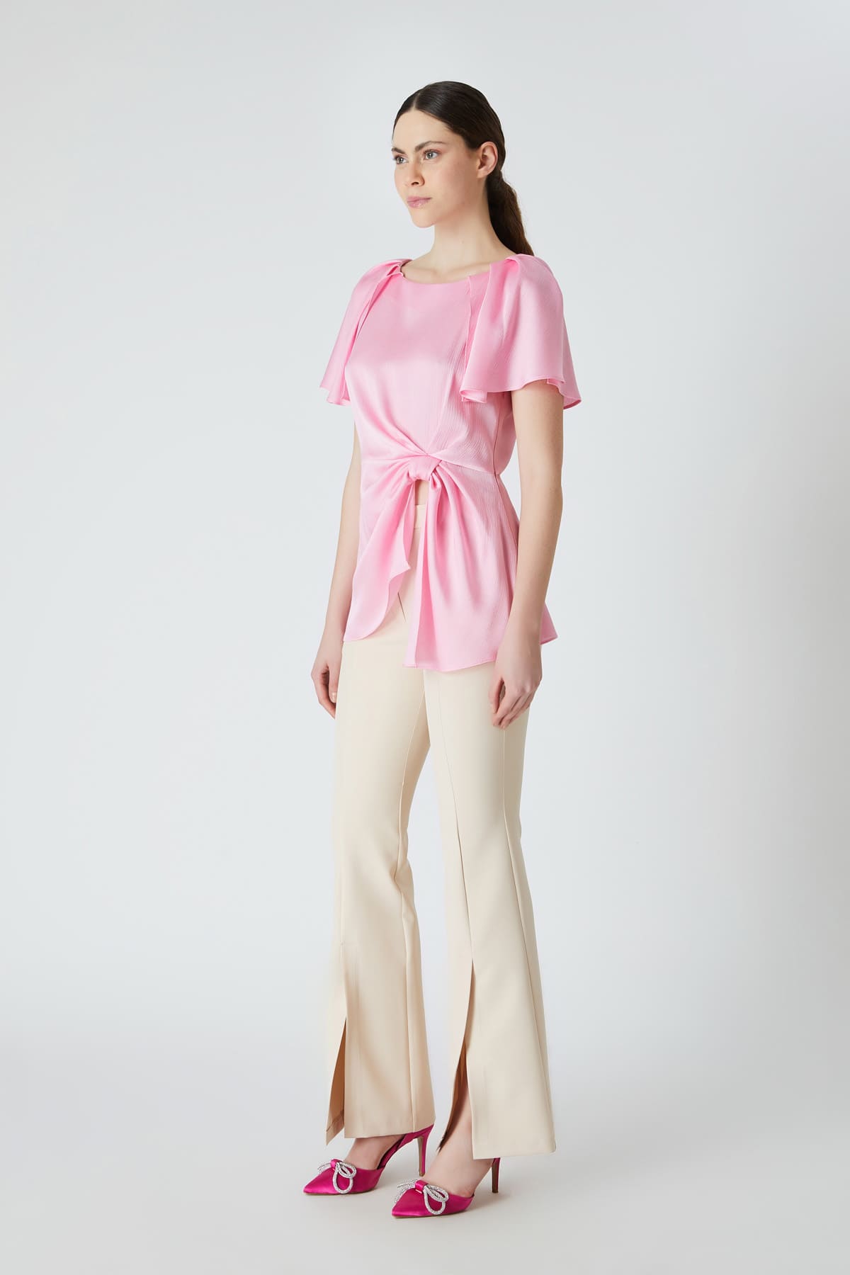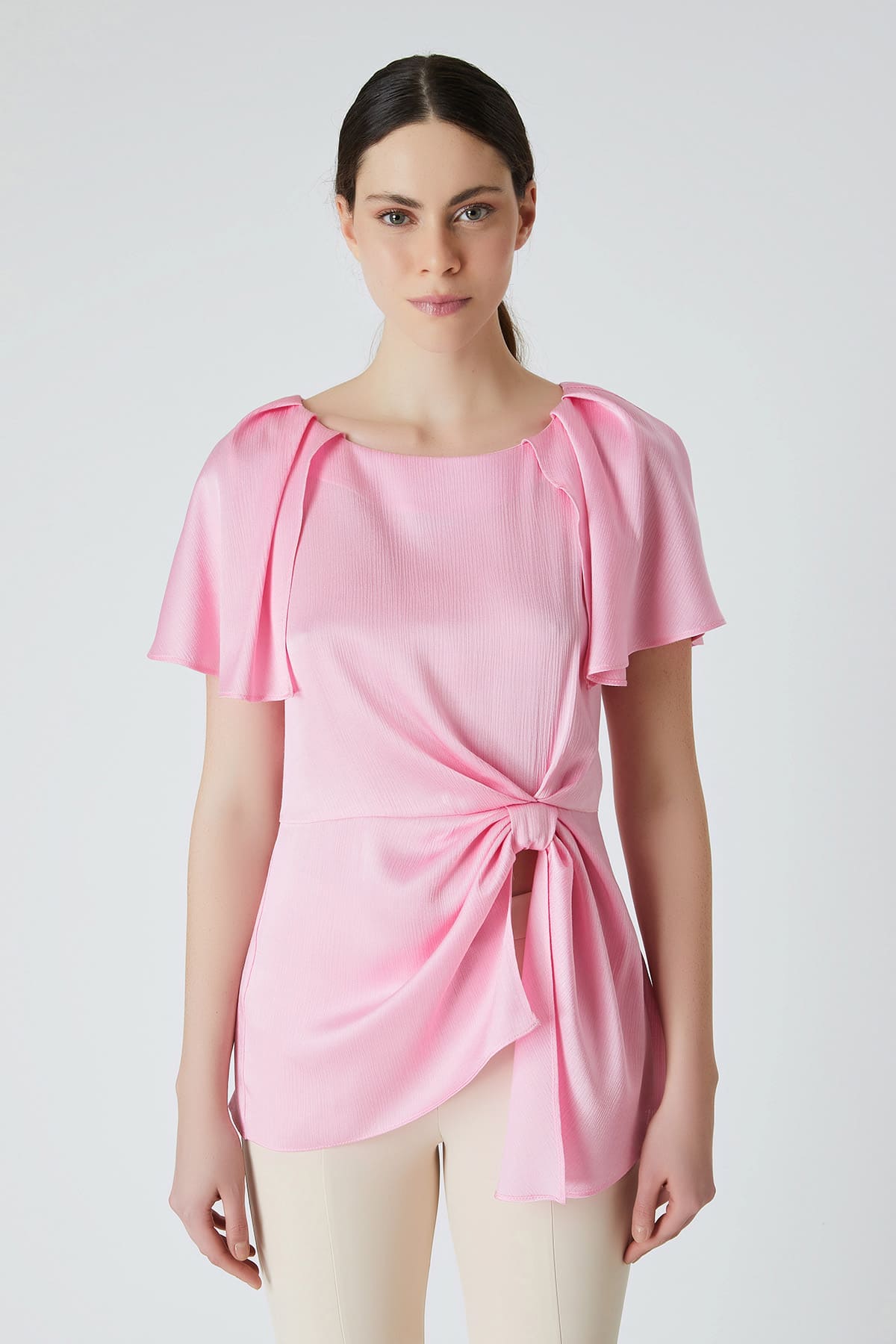 ÜRÜN BİLGİSİ:Viskon içerikli kırınkıl dokulu kumaş,yuvarlak yakalı,önden bant pileli,kolları yırtmaç detaylı.şık bluz.