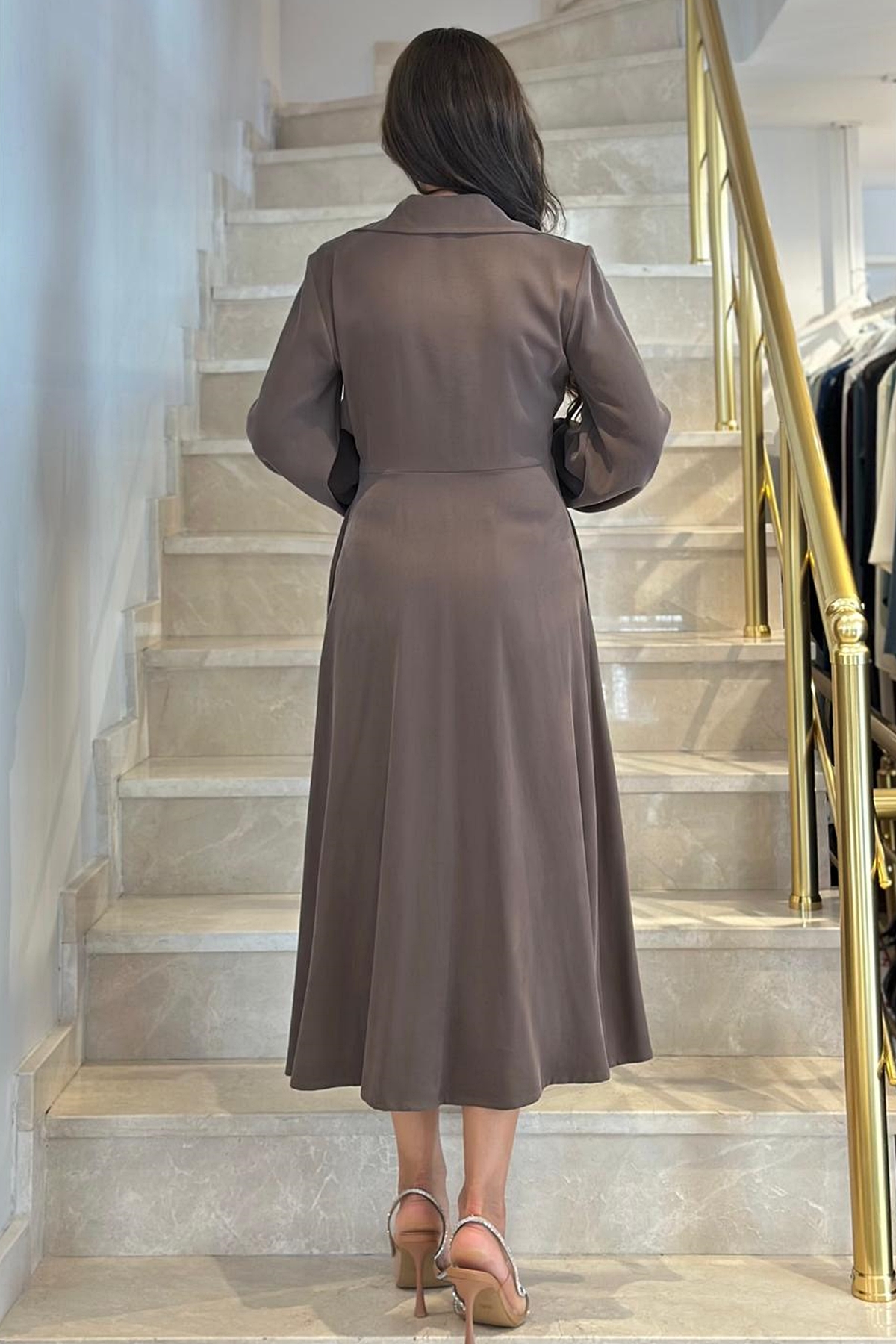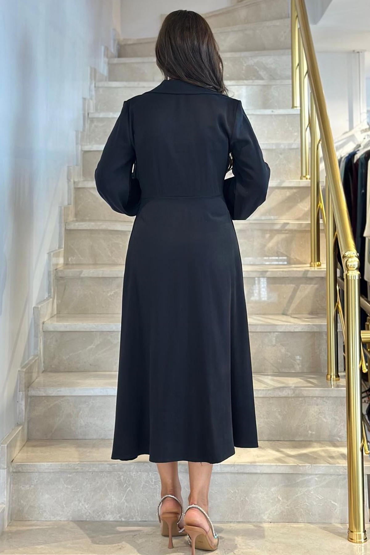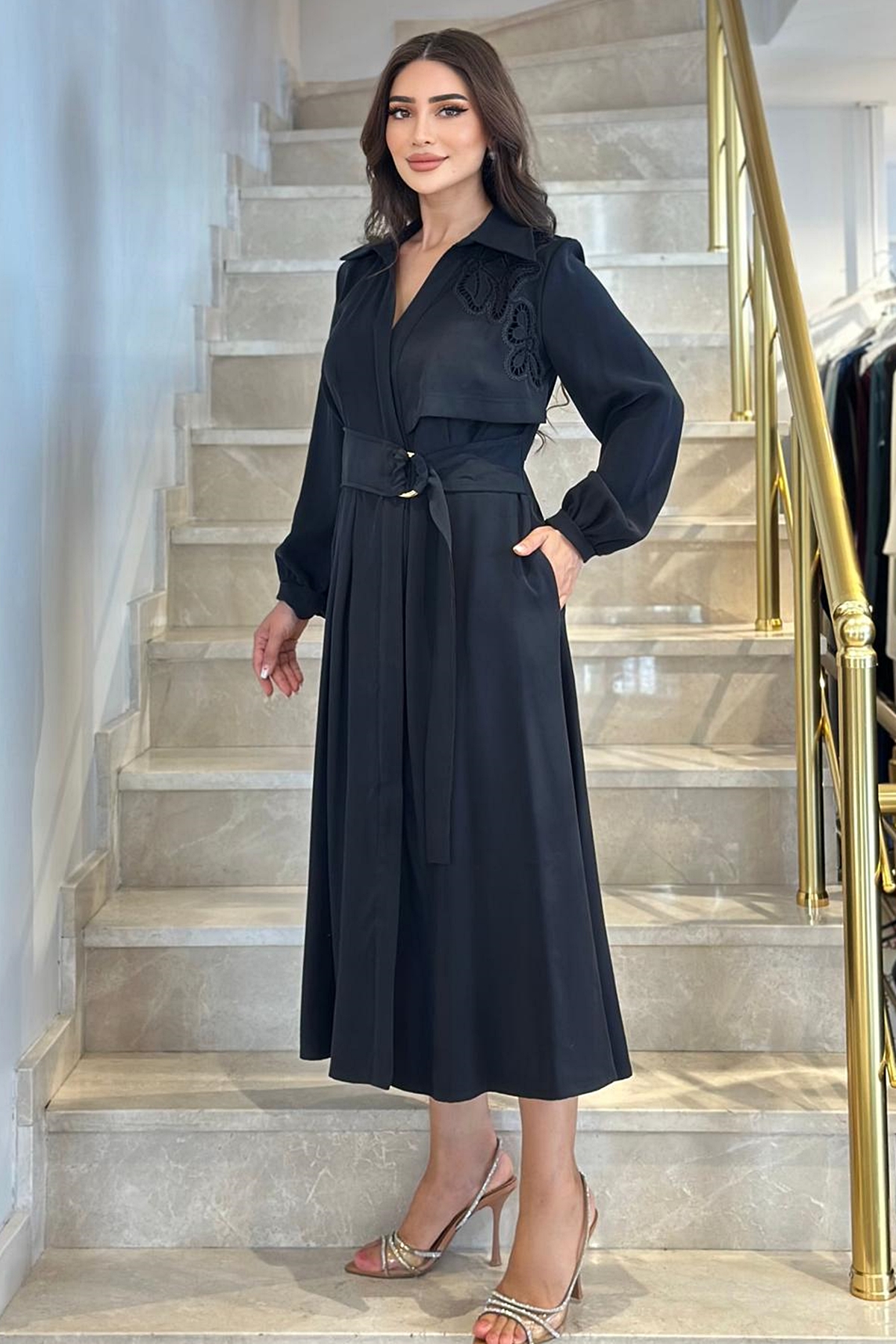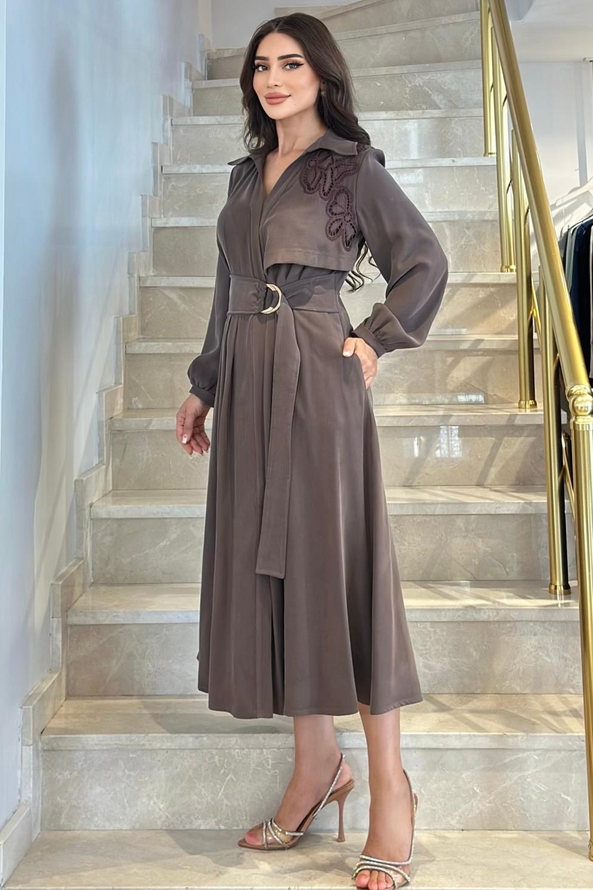 ÜRÜN BİLGİSİ:Nefes alabilir dökümlü kumaş,yakalı,tek tarafı nakış dokunuşlu,kemerli,astarsız şık elbise.