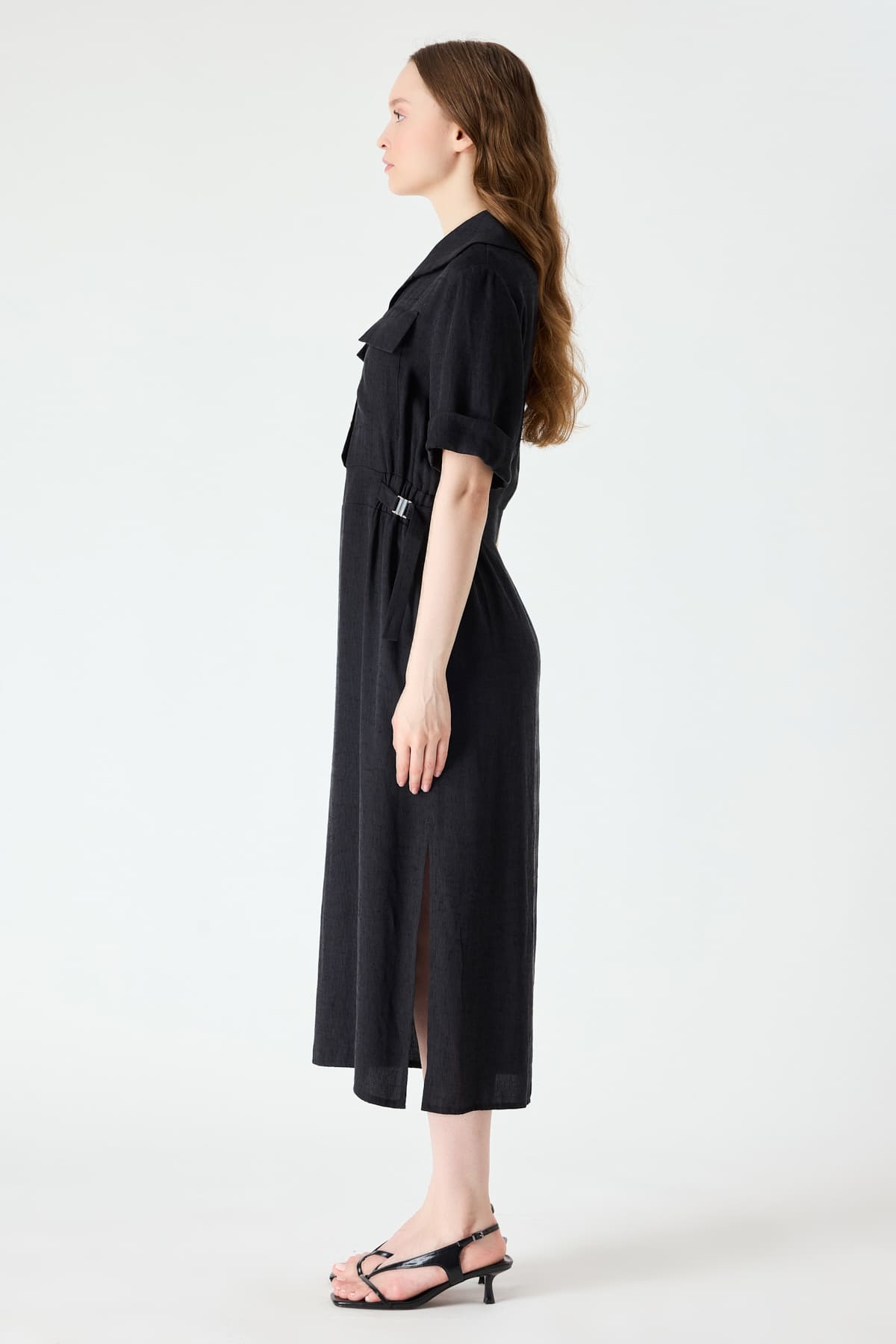 ÜRÜN BİLGİSİ:Modal dokulu doğal elyaflı kumaş,yakalı,yarım kollu,cepli,beli toka detaylı,astarsız diz altı elbise.