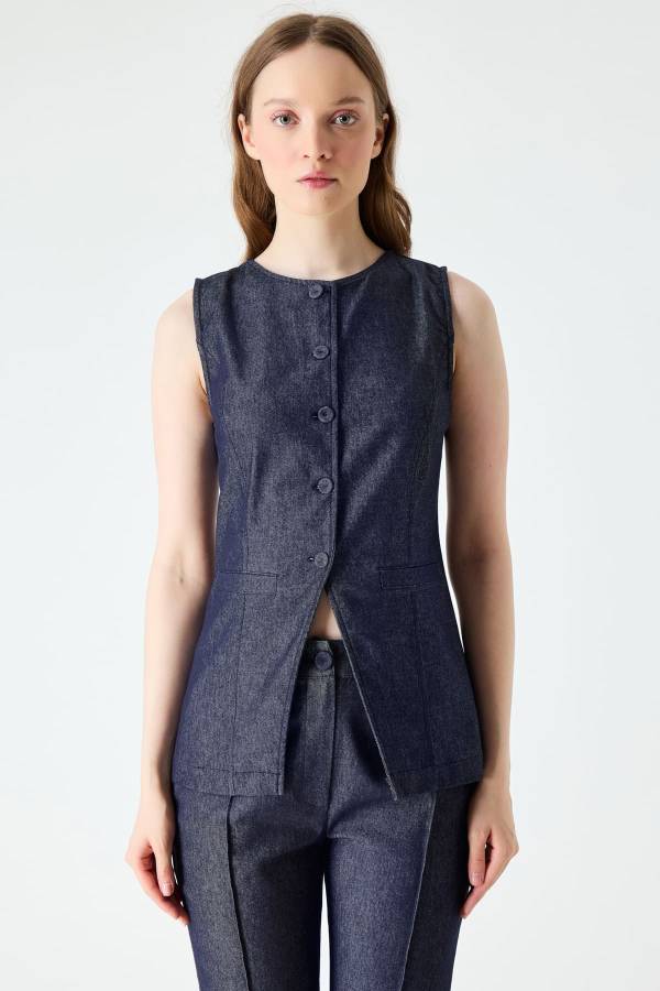 Yırtmaç detaylı düğmeli kot yelek