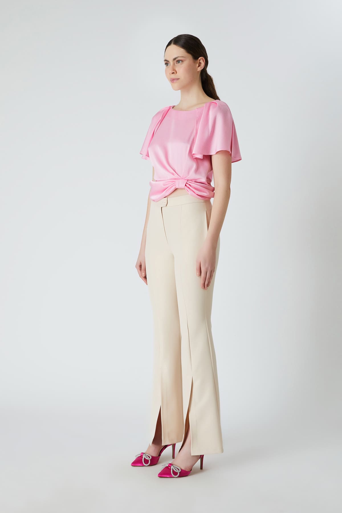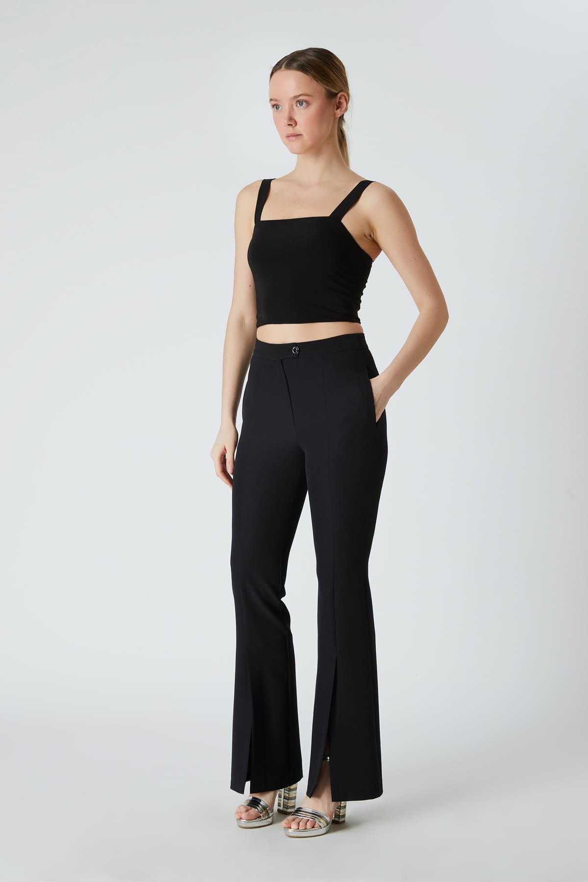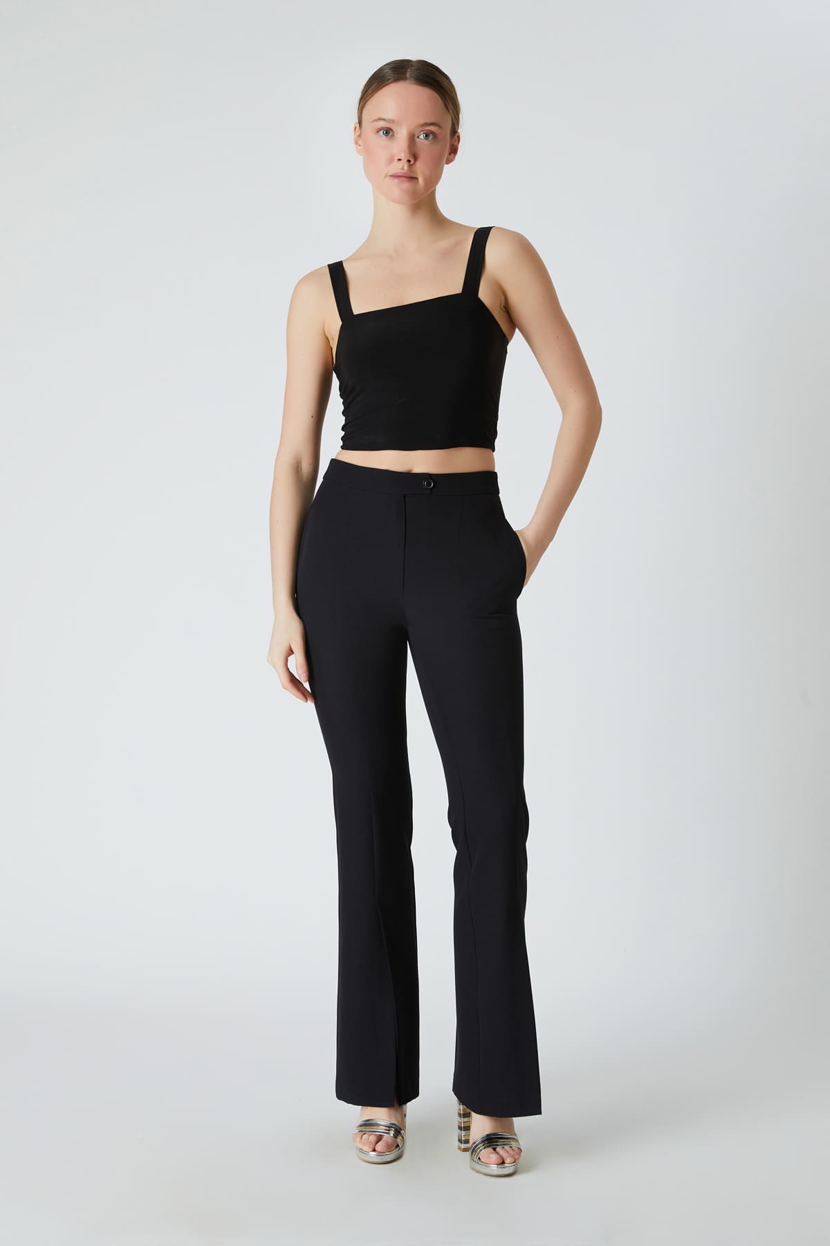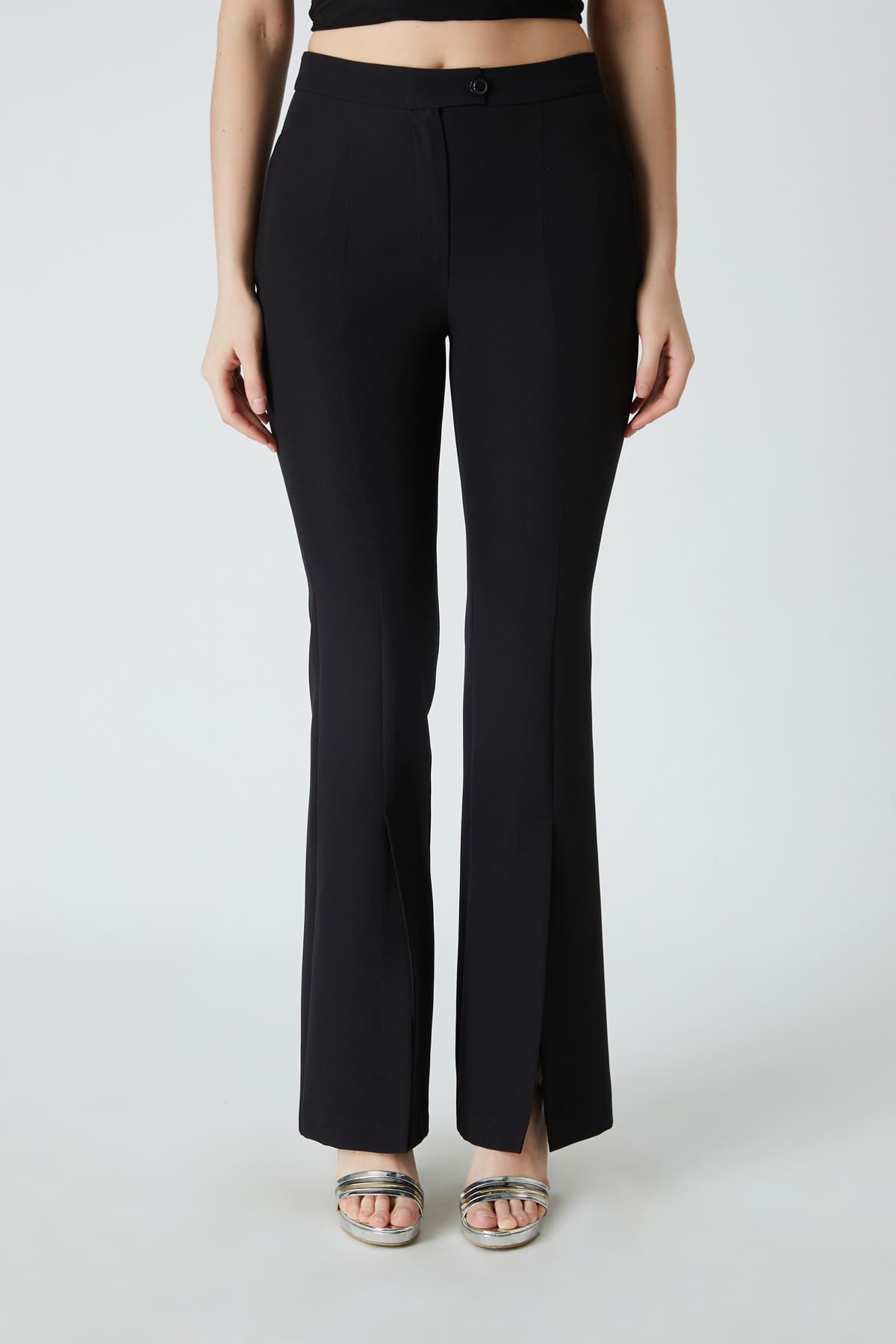 ÜRÜN BİLGİSİ:Esnek dokulu dokuma kumaş,düğme kapamalı,yan cepli,paçası yırtmaç detaylı,fit form ispanyol paça pantolon.