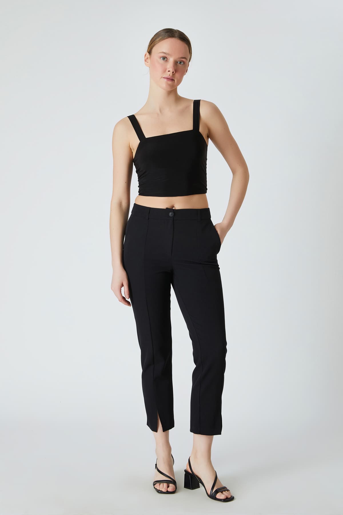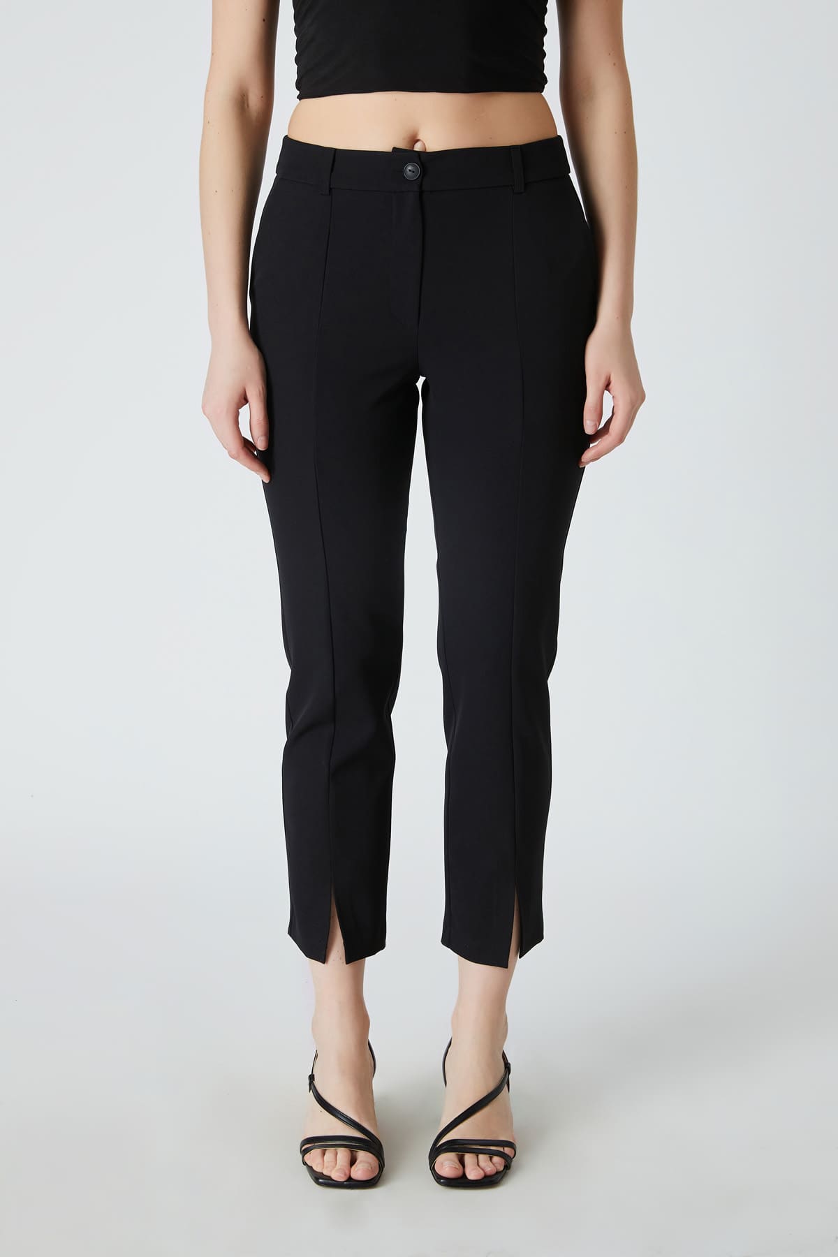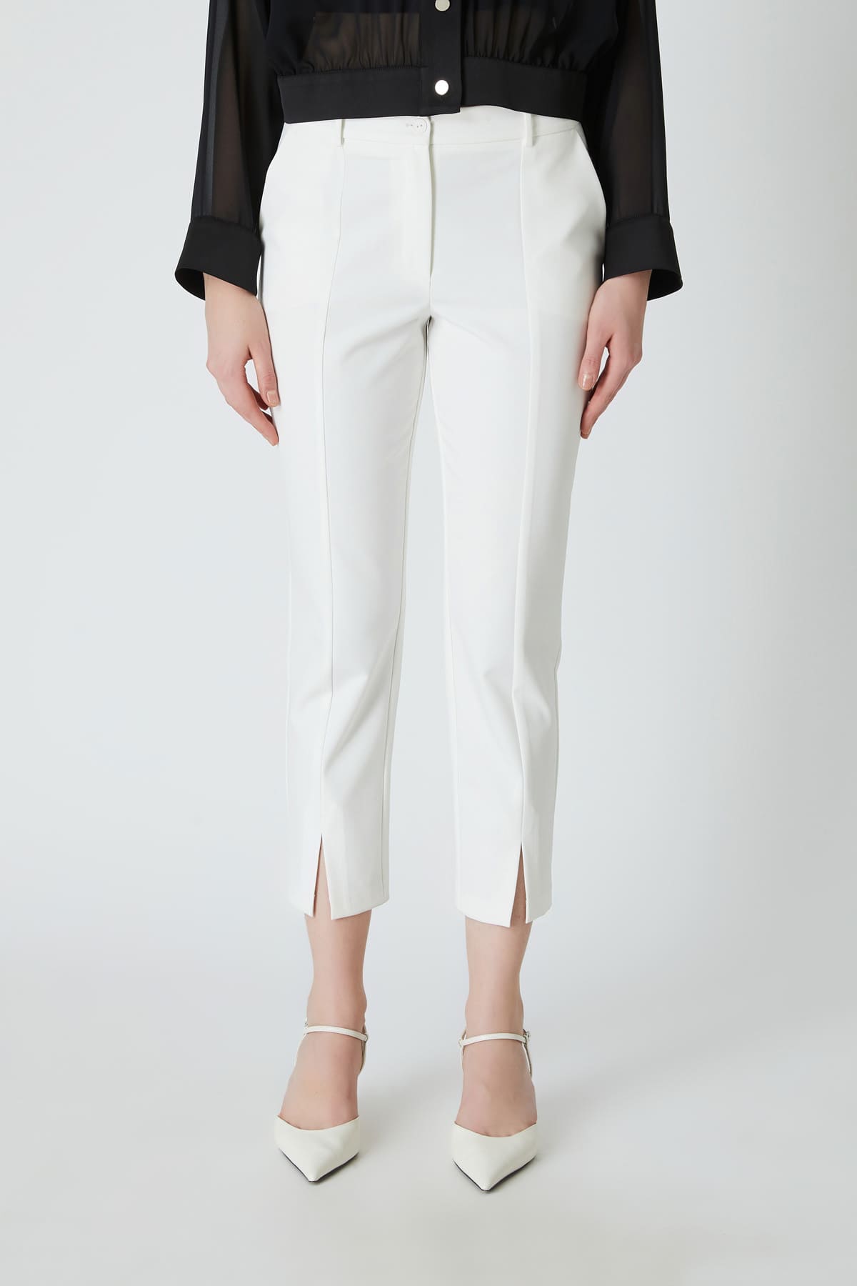 ÜRÜN BİLGİSİ:Esnek dokulu kumaş,normal bel,yan cepli,önü kesikli,yırtmaç detaylı,fit form pantolon.