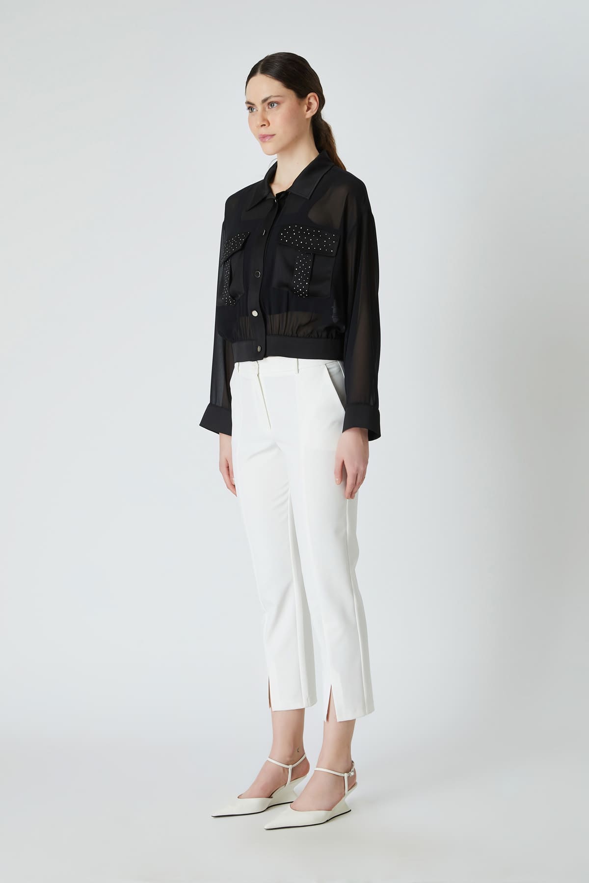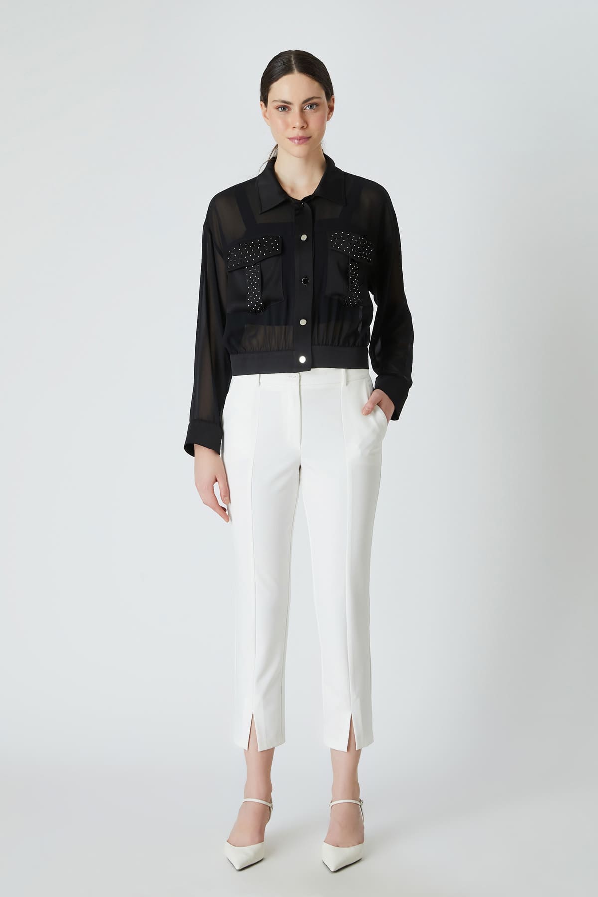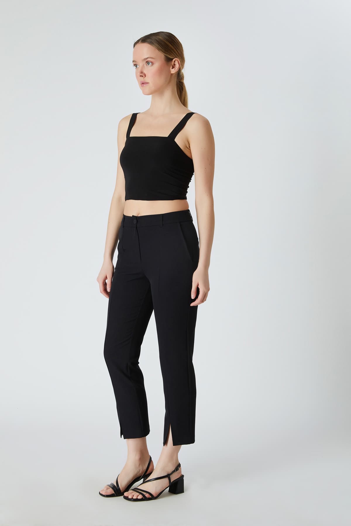 ÜRÜN BİLGİSİ:Esnek dokulu kumaş,normal bel,yan cepli,önü kesikli,yırtmaç detaylı,fit form pantolon.