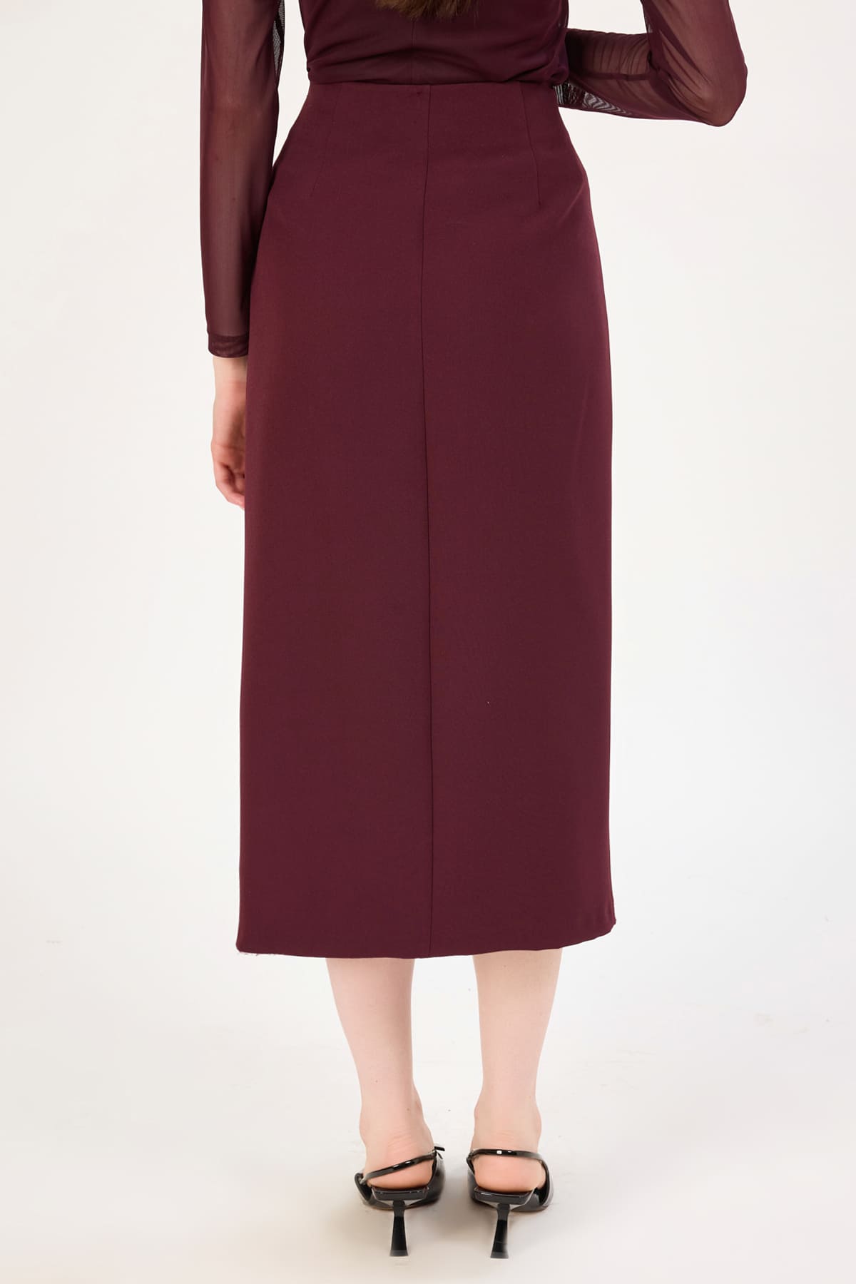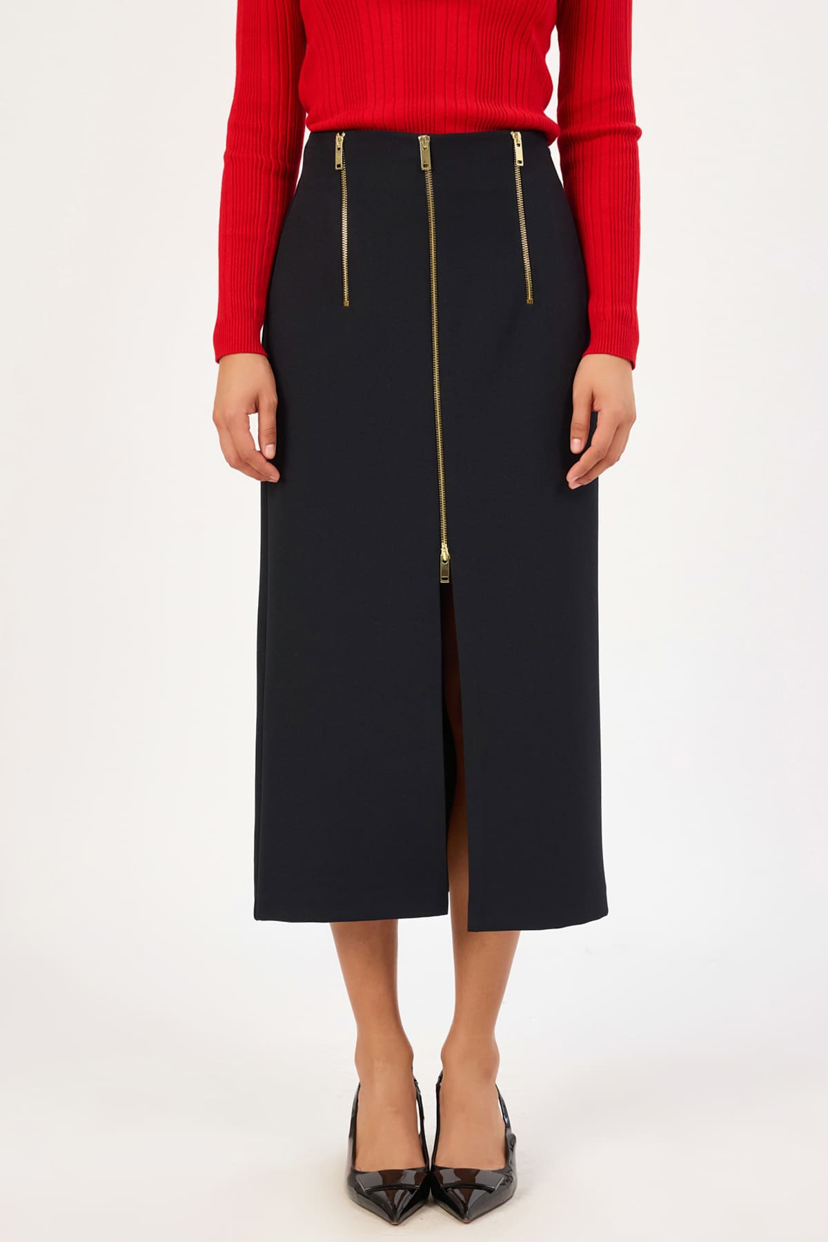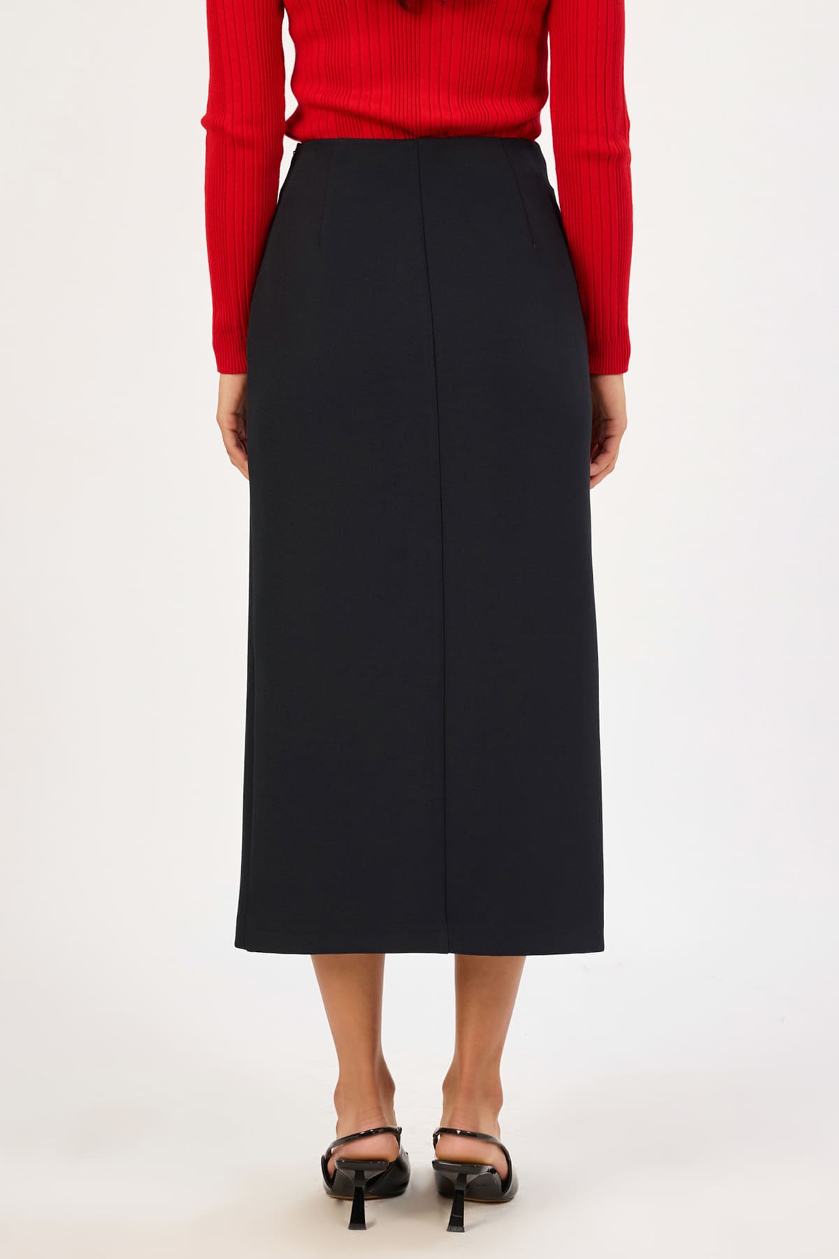 ÜRÜN BİLGİSİ:Sürdürülebilir içerikli krep kumaş,normal bel,metal fermuar detaylı,diz altı şık etek.