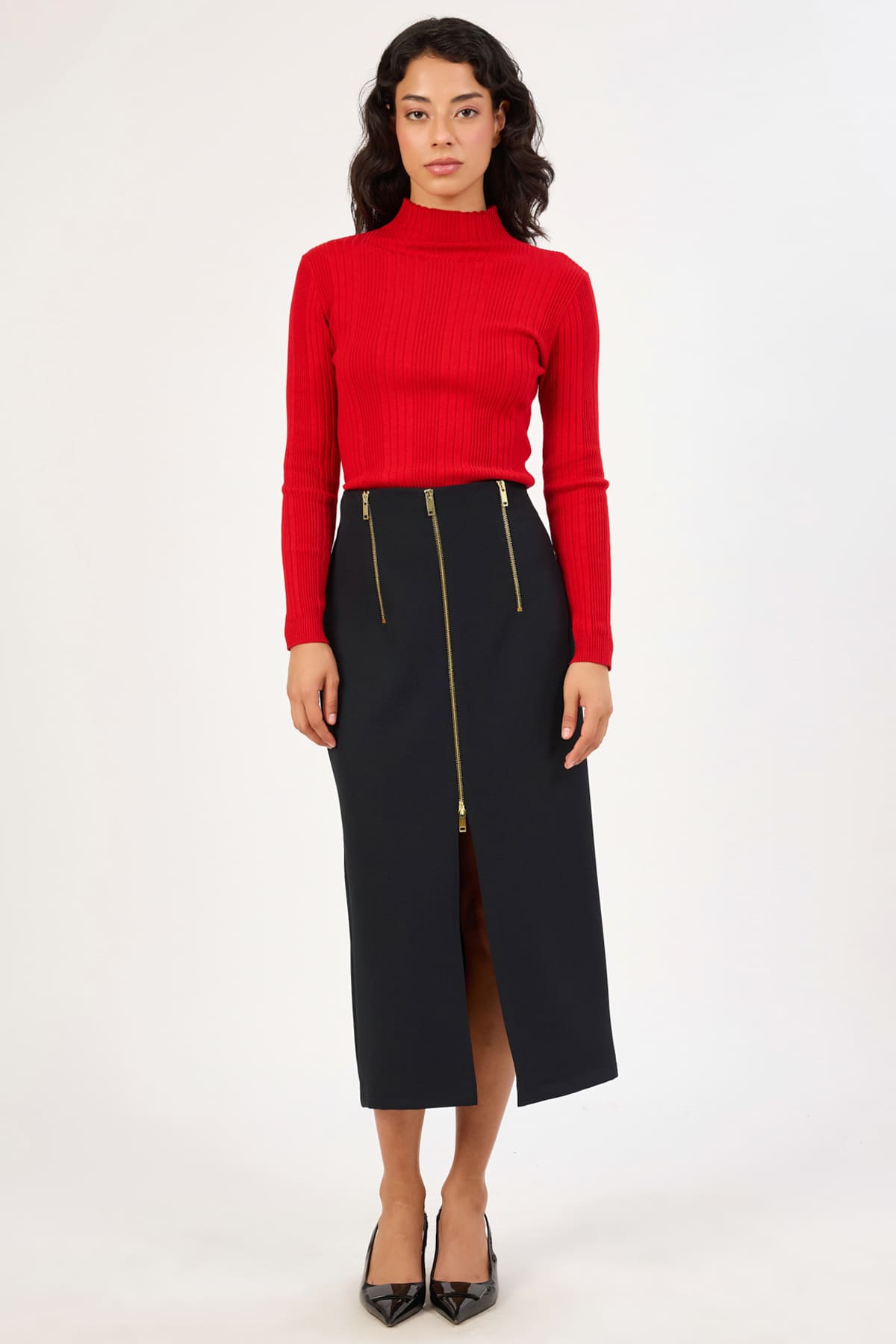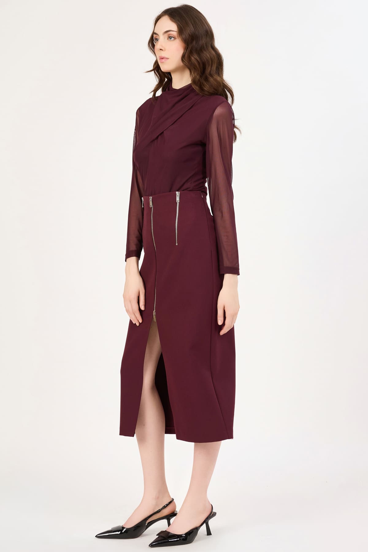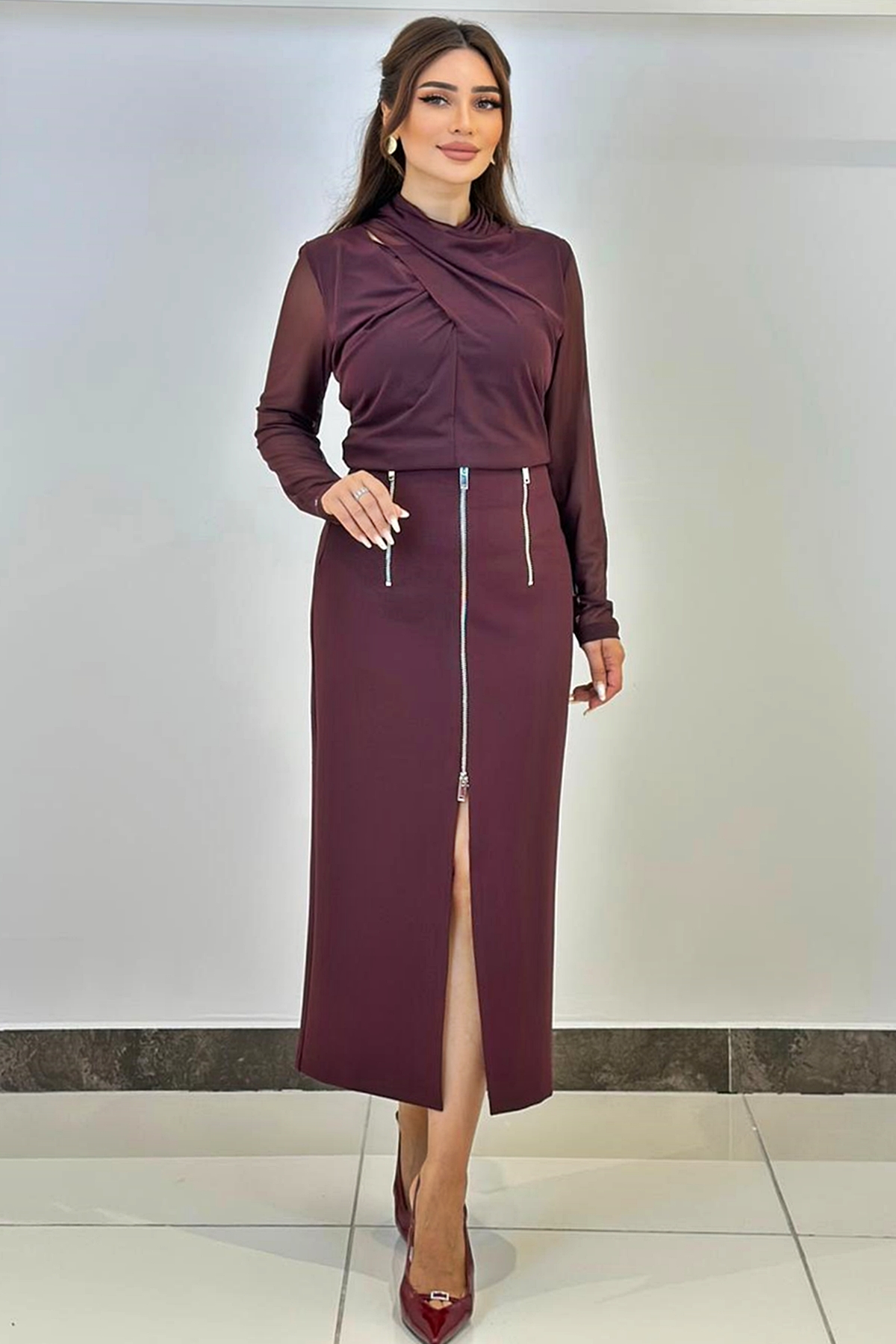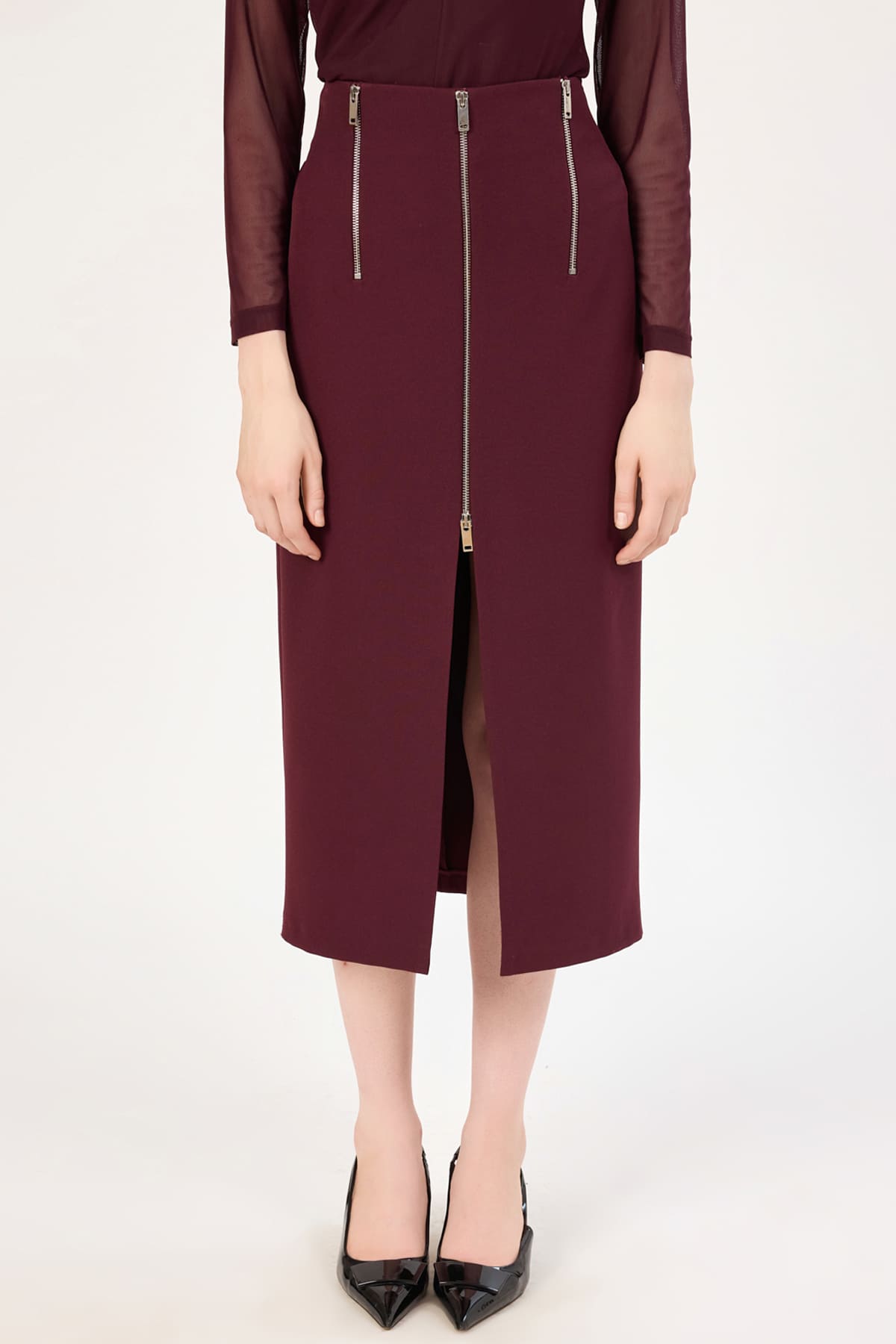 ÜRÜN BİLGİSİ:Sürdürülebilir içerikli krep kumaş,normal bel,metal fermuar detaylı,diz altı şık etek.