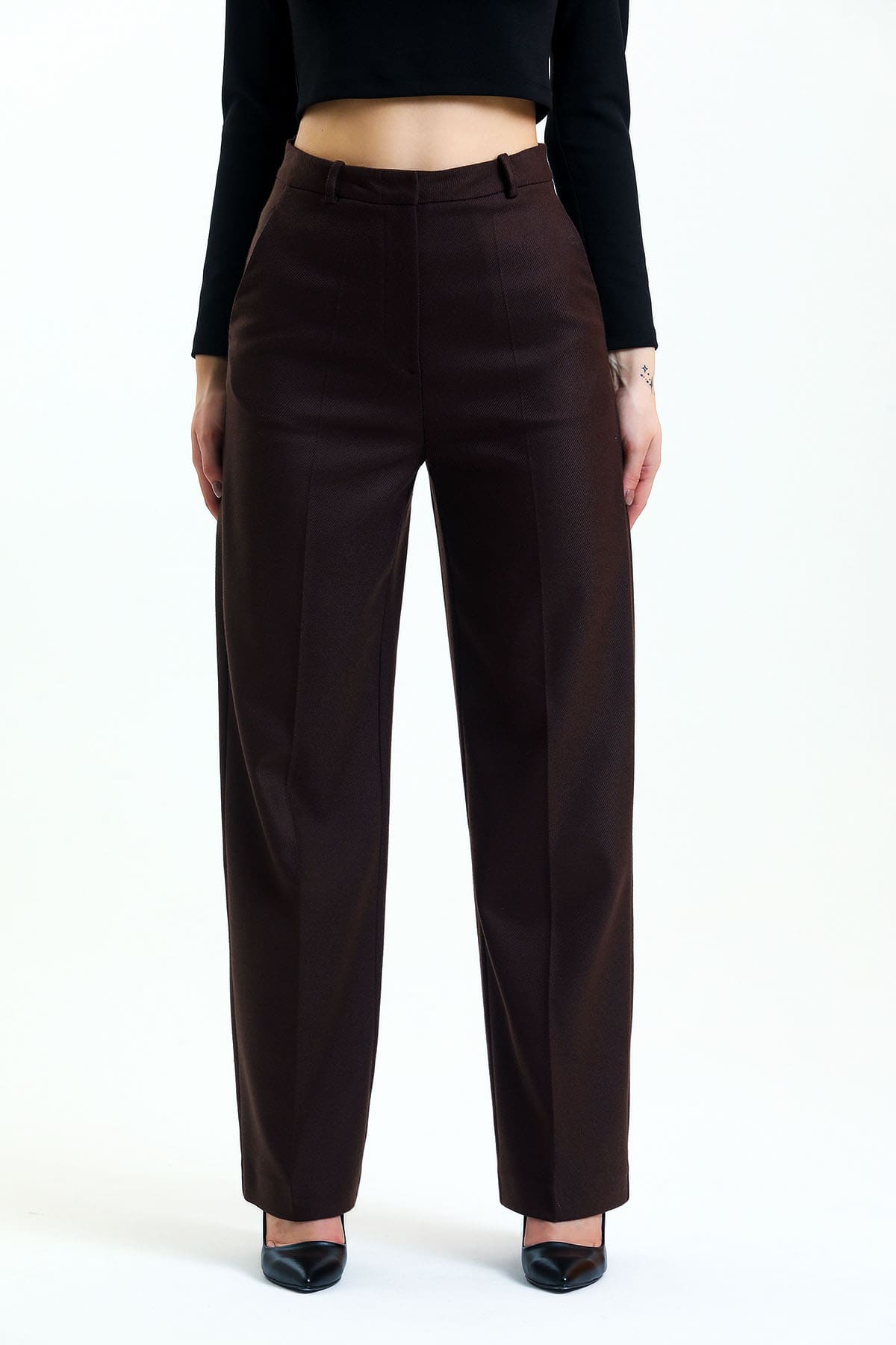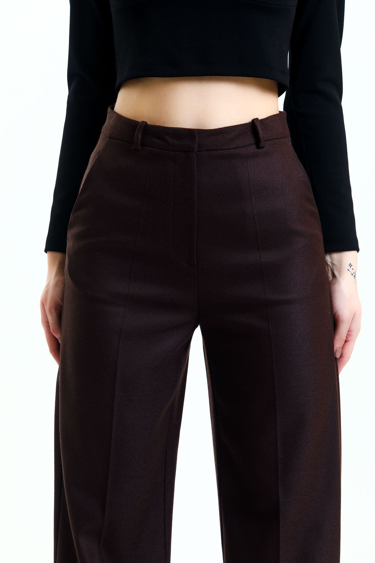 ÜRÜN BİLGİSİ:Diagonal dokulu kumaş,yüksek bel,yandan cepli,arkası süs çift fileto cepli,geniş paça pantolon