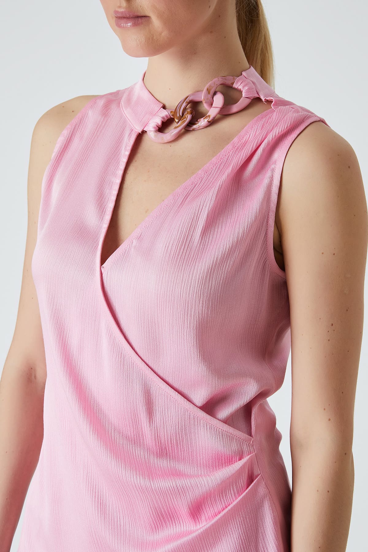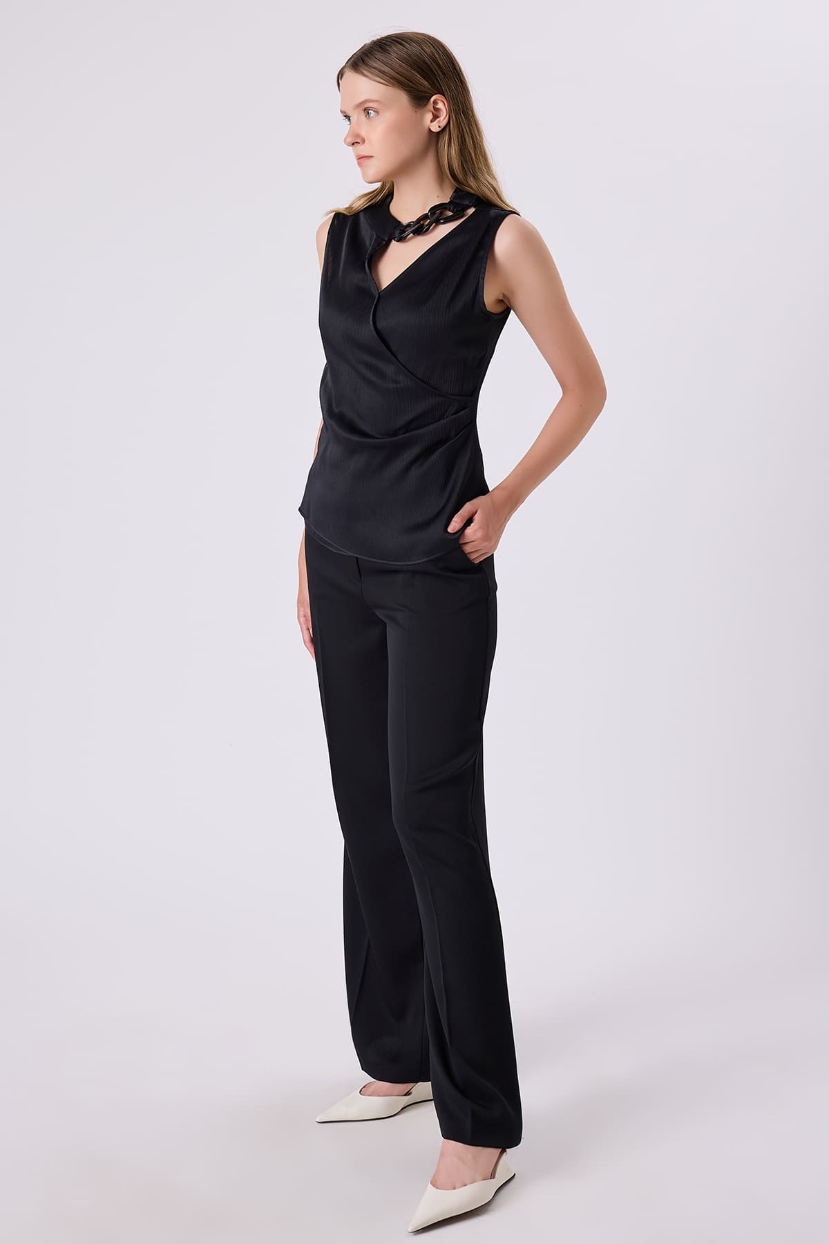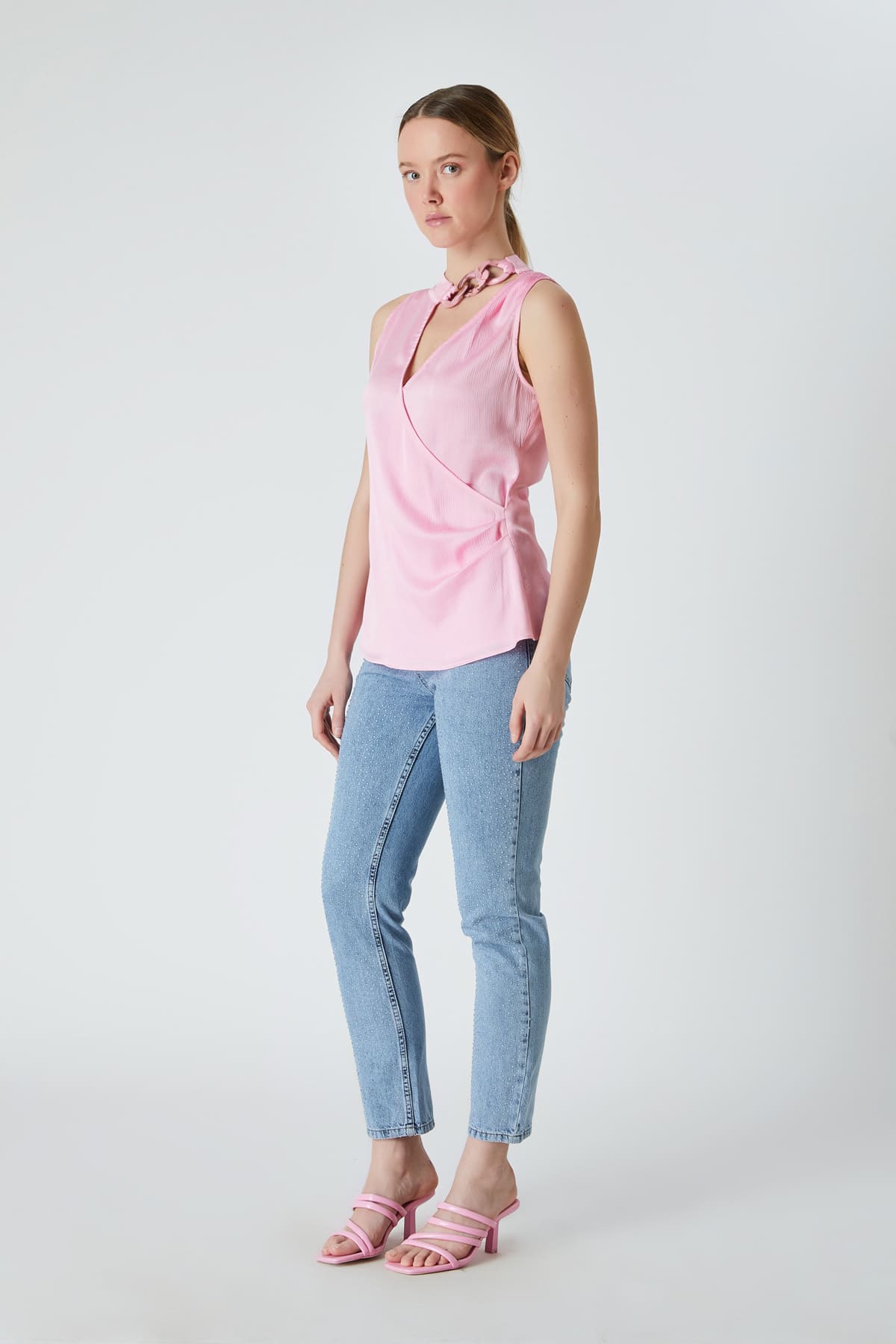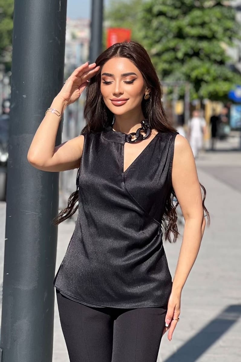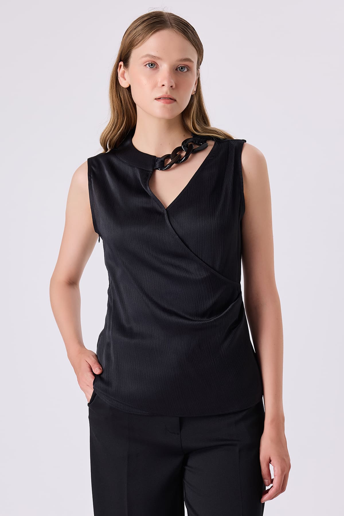 ÜRÜN BİLGİSİ:Viskon içerikli kırıkıl kumaş,asimetrik yakalı,zincir detaylı,anvelop kapamalı,sıfır kollu,şık bluz.